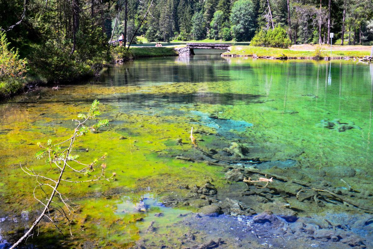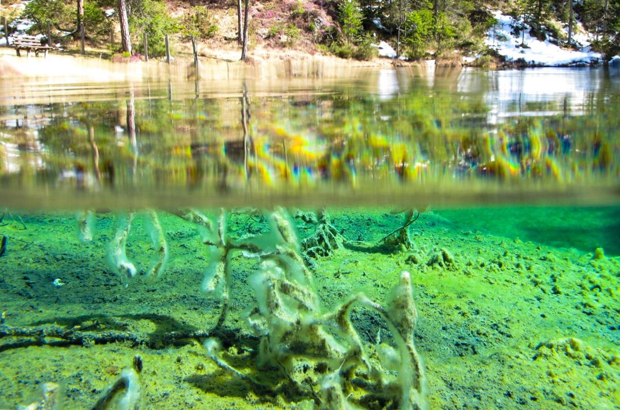 Überzogen sind diese teils versinterten Gehölze mit feinen und empfindlichen hellen Schleimalgen, die auch vom Ufer aus sichtbar sind und die der Szenerie den Charakter einer Märchenlandschaft verleihen. König Ludwig II. von Bayern hatte Schloss Fernstein und die umgebenden Seen deshalb zu seinem liebsten Ausflugsziel erkoren.