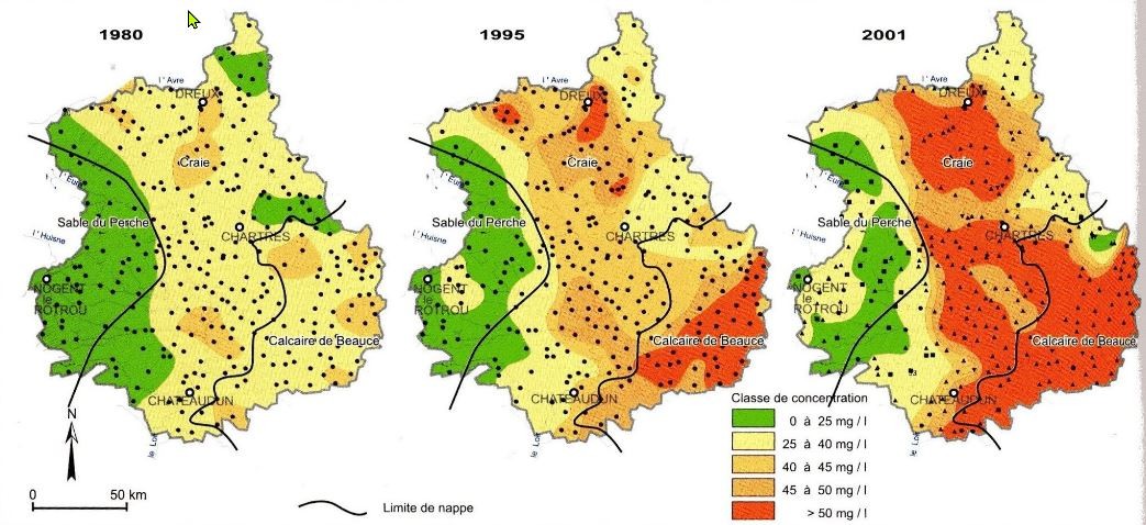 In jüngerer Zeit sind vor allem Mikroplastik, Medikamente und PFAS (per- und polyfluorierte Alkylsubstanzen) in den Fokus gerückt, ein hormonähnlicher Stoff, der in Verdacht steht, die Fortpflanzungsfähigkeit (nicht nur) von Fischen und Lurchen zu beeinträchtigen und der inzwischen selbst tiefere Grundwässer langfristig kontaminiert. Selbst 25 Jahre nach einem EU-weiten Verbot lässt sich noch immer Atrazin im Grundwasser nachweisen. Die meisten der rund 30.000 in Europa genutzten Chemikalien werden erst gar nicht umfassender untersucht. So gilt auch in Frankreich Nitrat aus Stickstoffdünger und Tierdung als Hauptproblem, das durch die Landwirtschaft eingetragen wird. Langzeituntersuchungen am ungespannten Grundwasser im Departement Eure-et-Loir (Chartres) verdeutlichen es: