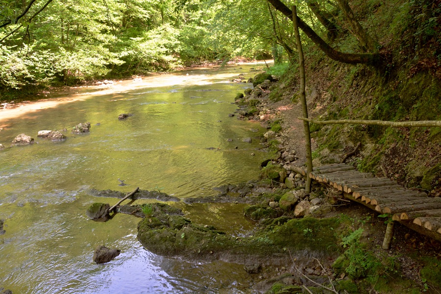Unterhalb des Plateaus, von dem das Wasser hinabstürzt, hat es ein tiefes Tal mit steilen Wänden in den Kalkstein gegraben und dabei einen Grundwasserleiter freigelegt, der mit mehreren Quellen in und am Fluss an die Oberfläche tritt. Geht man von dem geräumigen Parkplatz Vodopad Blihe Parking hinab zum Fluss und nimmt unten angekommen den schönen Pfad flussabwärts, so gelangt man in etwa zehn Minuten … . Dabei kommt man an einer kleinen Mühle vorbei, die noch gelegentlich in Betrieb genommen wird, um das Mahlen von Mais vorzuführen. Der Weg flussauf führt auf einem gut ausgebauten Weg in wenigen Minuten zu einer Plattform, von der aus man den Wasserfall bewundern kann. Wie die meisten Karstflüsse führt auch die Bliha im Sommer wenig Wasser, so dass sich das Frühjahr am besten für einen Besuch eignet.