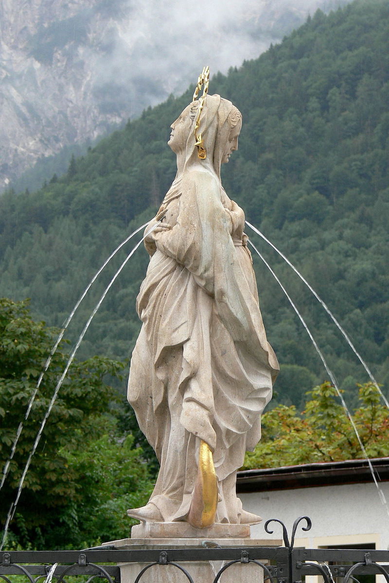 Wer noch Lust auf eine Rarität hat und die etwa 50 Höhenmeter hinauf nach Großgmain nicht scheut, findet dort bei der Wallfahrtskirche einen wunderschönen barocken Marienbrunnen. Die doppelte Brunnenfigur einer Maria lactans ist eine früher verbreitete Darstellung der Mutter Jesu als stillende Gottesgebärerin. Der Brunnen steht unter Denkmalschutz.