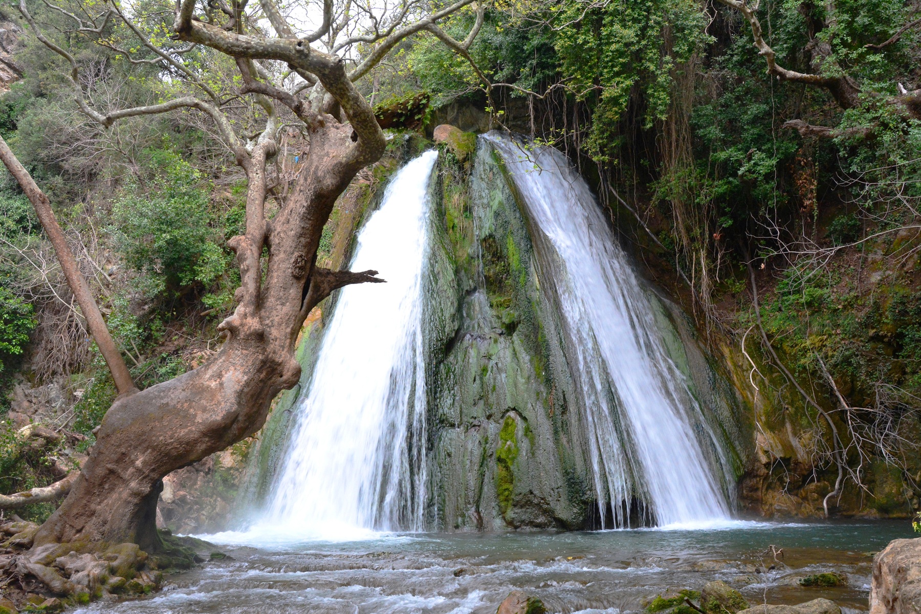 Unten an dem idyllischen Wasserfall stehen uralte Platanen von knorrigem Wuchs. Die Luft ist feucht und kühl und das Wasser in den zwei Gumpen unterhalb der Kaskaden lädt zu einem Bad ein – zumindest im Frühjahr und Frühsommer, solang der Bach ausreichend Wasser führt. Als typischer Karstfluss verkommt auch der Mokistianos-Bach wie so viele in Griechenland im Sommer zu einem müden Rinnsal. Auch früher schon mussten die Mühlen, die einst an seinen Ufern standen, ihren Betrieb dann über viele Monate einstellen.