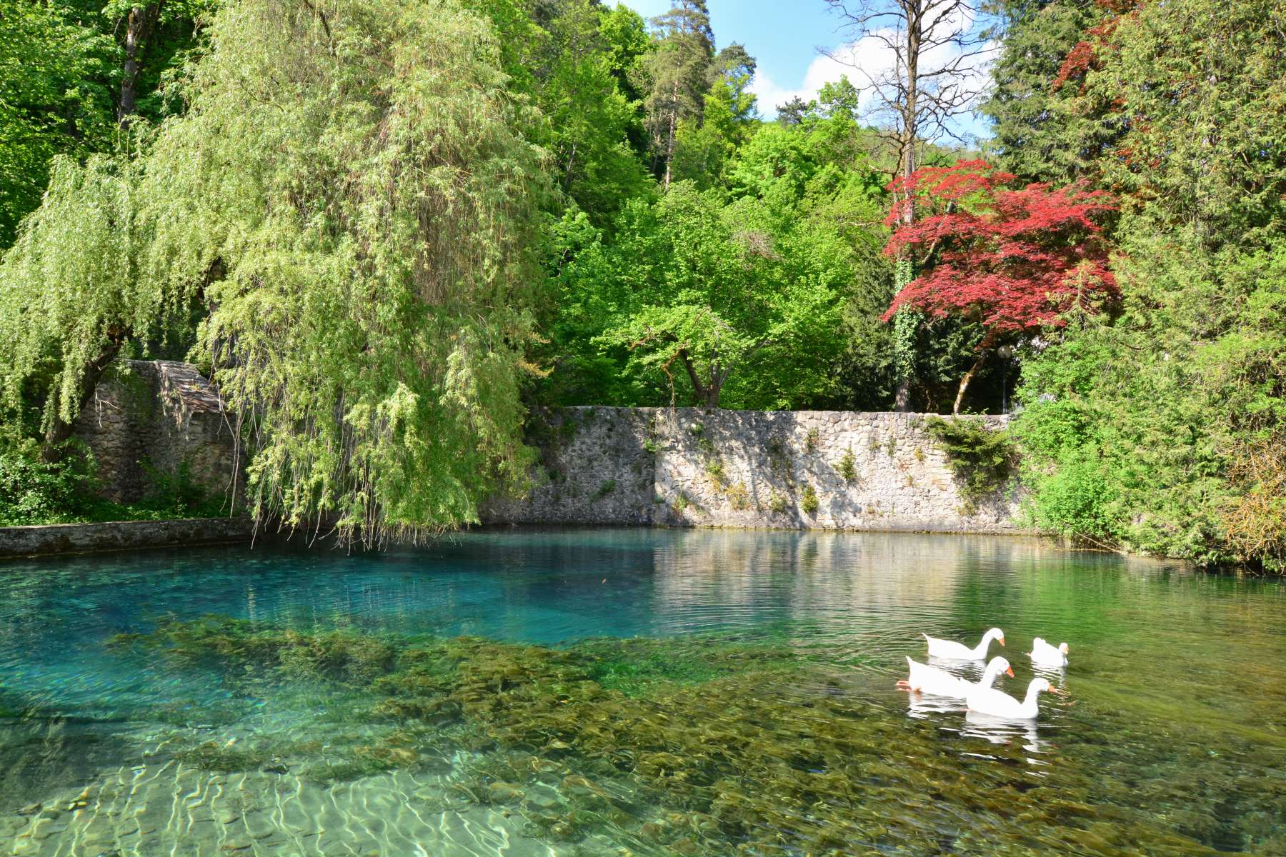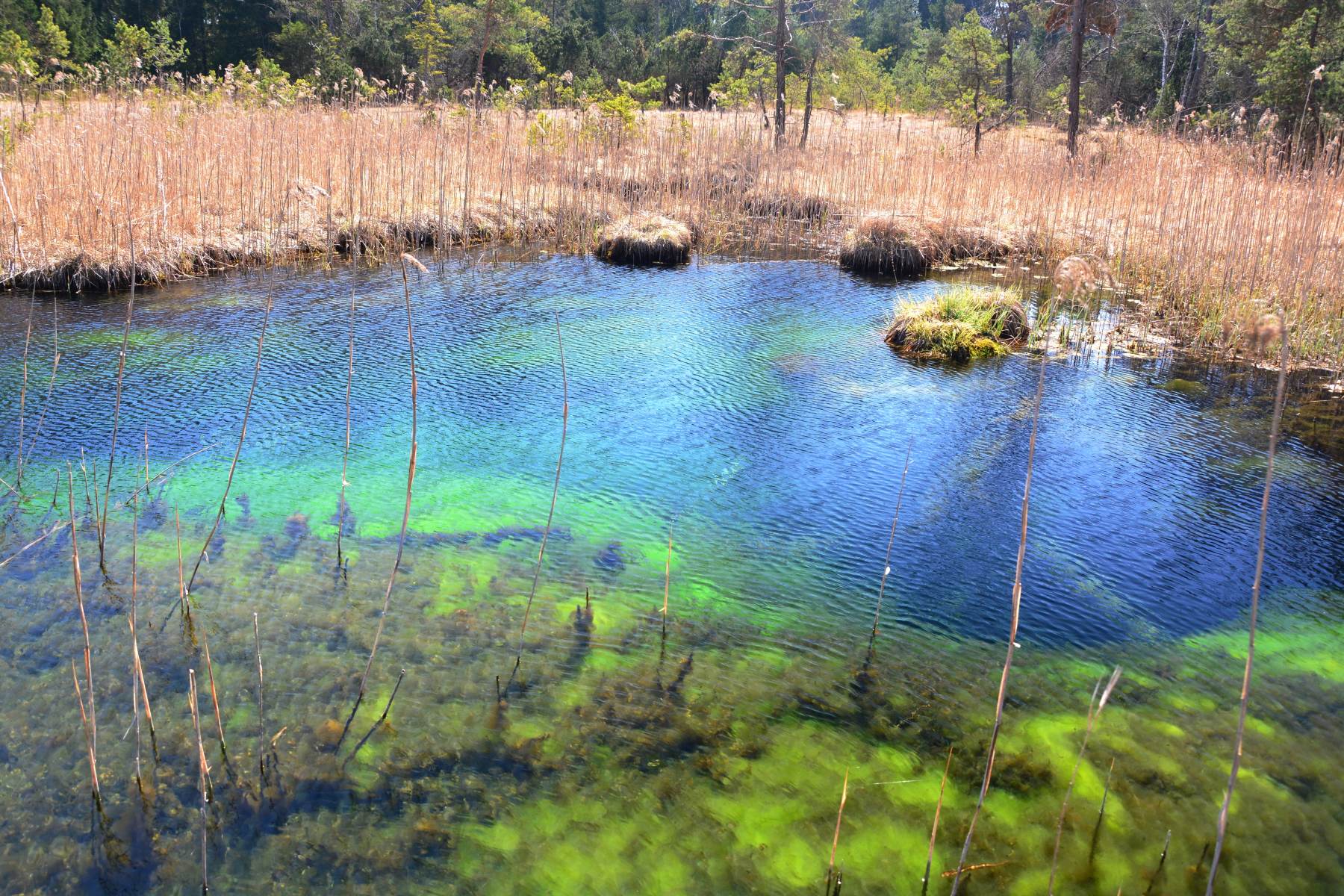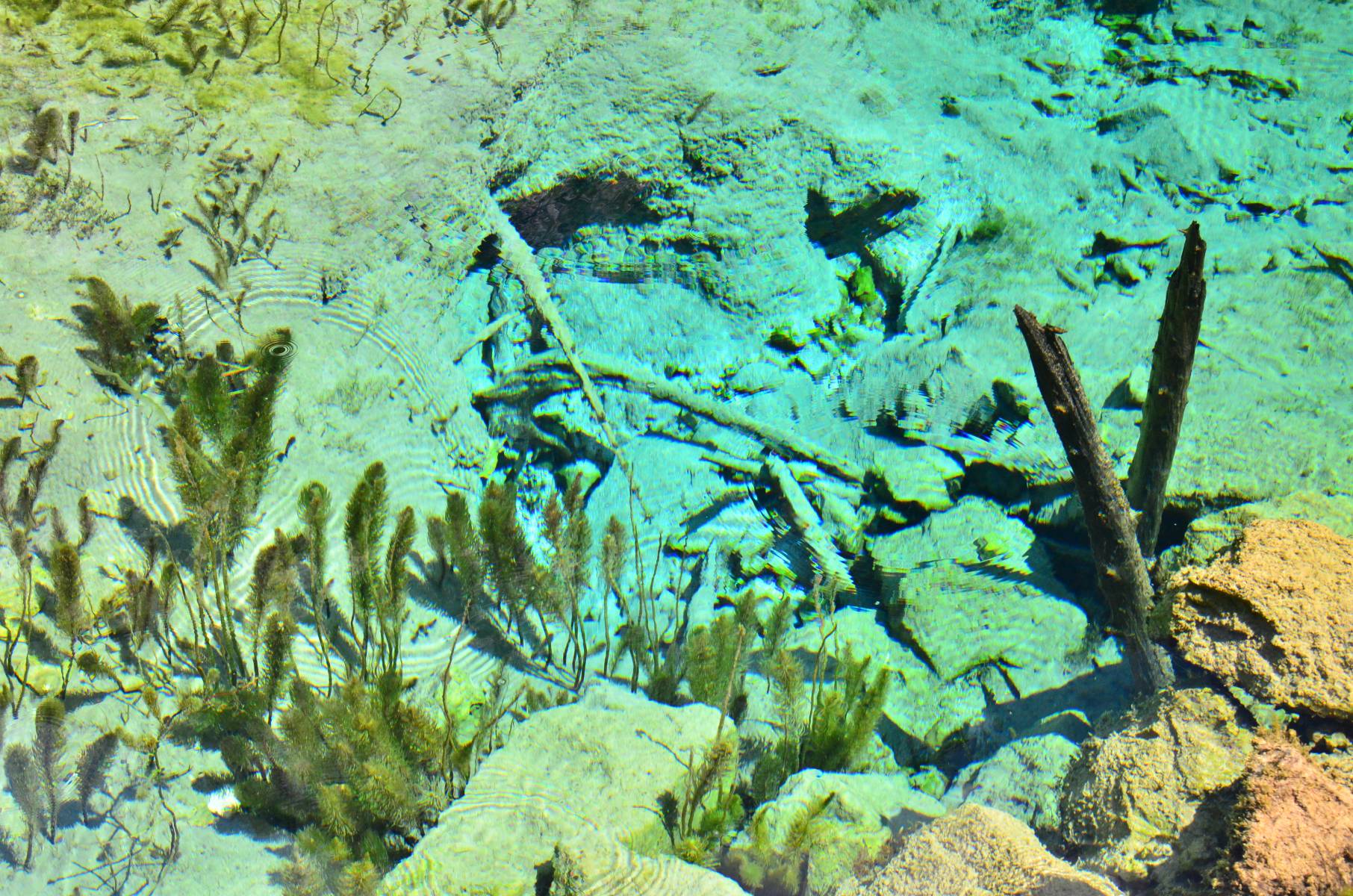 Vor allem im Winter, Frühjahr und Frühsommer sind viele Quelltöpfe im Karst wegen ihres glasklaren Wassers von leuchtend blauer oder grüner Farbe außerordentlich schön. Während der Schneeschmelze und nach Starkregen kann sich ihr Wasser durch mitgespülte Sedimente allerdings so stark eintrüben, dass es graubraun aus der Erde schießt. Im Verlauf des Sommers bilden sich in und auf vielen Tümpeln wegen ihres mittlerweile hohen Nährstoffgehaltes dann braune und schleimige Algen, die der ursprünglichen Flora den Lebensraum streitig machen. So sind manche Arten von Armleuchteralgen, Laichkraut, Wasserstern und Quellmoos inzwischen selten geworden.