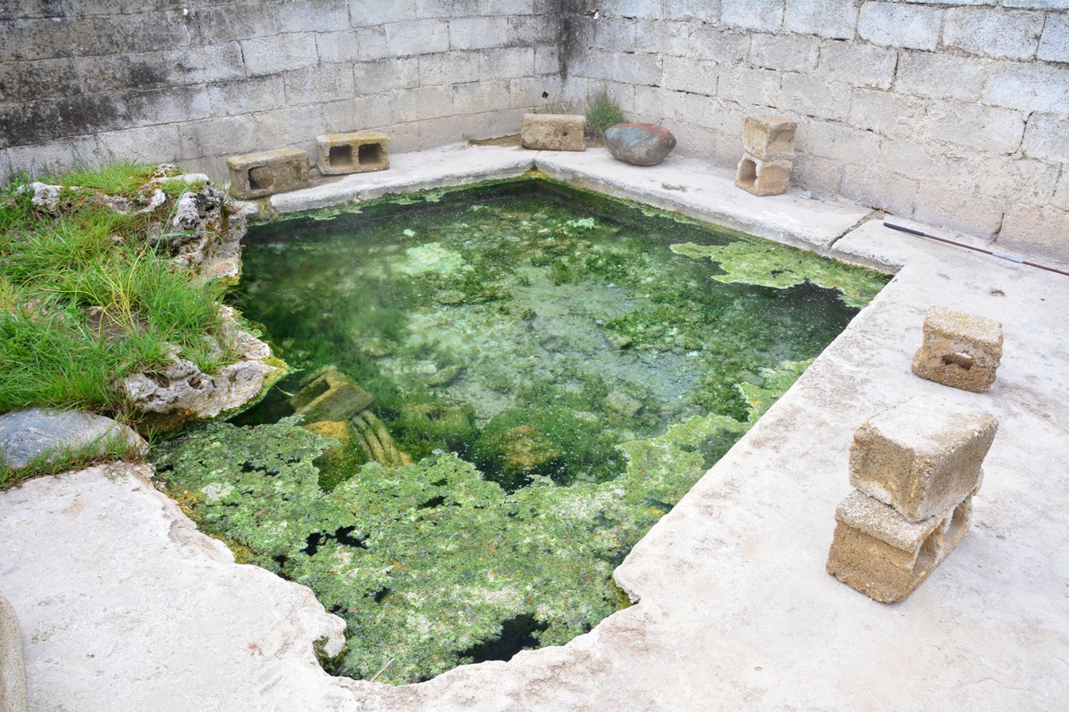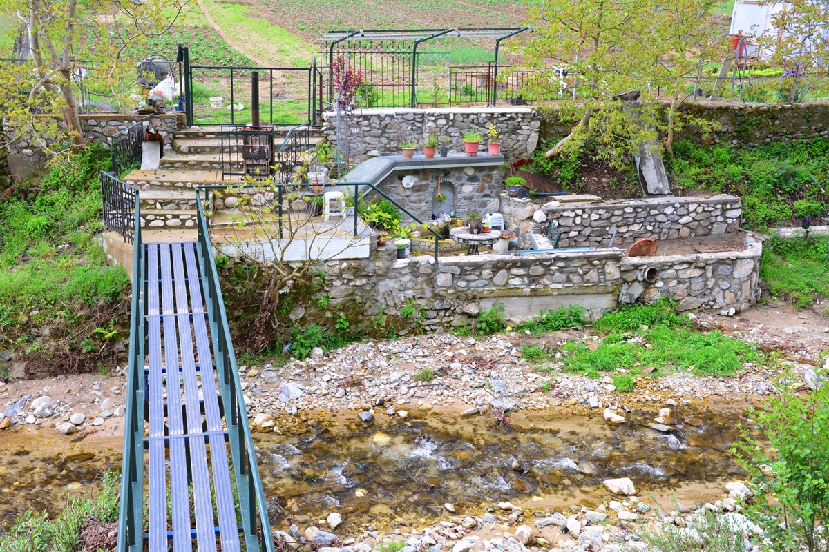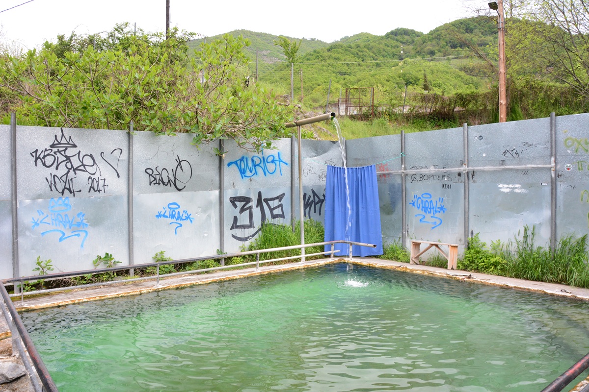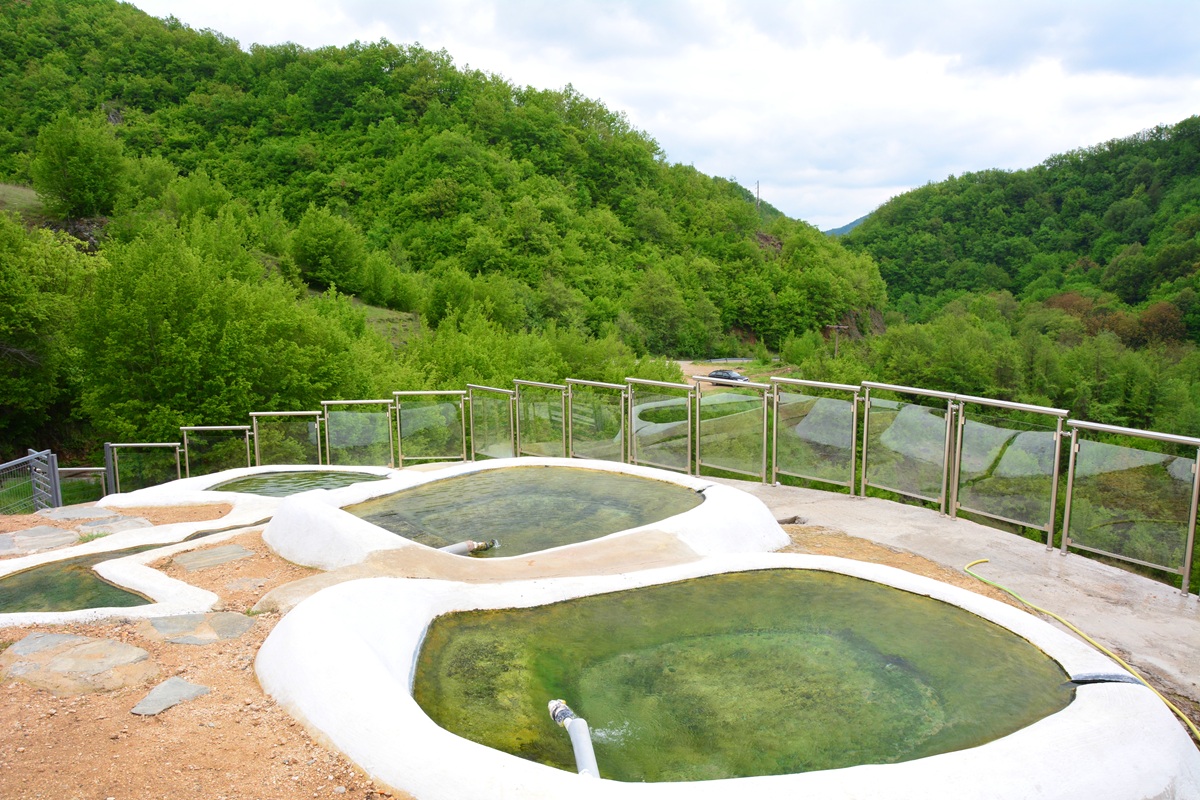 Das Wasser tritt hier so heiß aus, dass die umfasste Quelle wegen Verbrühungsgefahr mit einem Maschendraht verschlossen ist. Sie dürfte zu den heißesten in Griechenland gehören. Das glasklar und grün gefärbte Wasser quillt mit Druck aus dem Untergrund und mit ihm zusammen steigen unablässig Gasblasen auf. Von hier aus wird das Wasser über Rohre und offene Kanäle in verschiedene gemauerte Becken geleitet, die durch die Abkühlung etwas unterschiedliche Temperaturen haben. So kann man sowohl im Sommer wie im Winter hier ein Bad nehmen. Von den Pools führt unter dem Ort ein Feldweg nach West, an dem man bunte Sinterablagerungen findet, die das ablaufende Wasser geschaffen hat. Auf der WASSERWIKI-Quellenkarte findet man zahlreiche weitere Einträge zu Kalt- und Warmwasserquellen in der Gegend, die man zu Fuß erkunden kann. Die Straße, entlang derer sie liegen, ist wenig befahren.