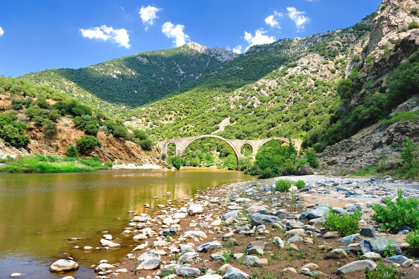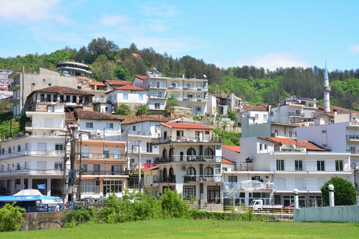Tatsächlich verirren sich nur selten Fremde hierher, wo die Grenze zwischen den Regionen Makedonien und Thrakien in die Ausläufer der nördlichen Gebirge eintritt, die an der Grenze zu Bulgarien bis 2.000 Meter hoch aufragen. Sie sind die am wenigsten erschlossenen in Griechenland. Aufgrund der wechselvollen Geschichte zwischen Orient und Okzident gerät man hier oben mit einem Mal von der griechisch-orthodoxen in eine muslimische Welt. Viele der Häuser weisen türkische Einflüsse auf. Das Profil der Dörfer ist von Minaretten geprägt. Die Frauen tragen Kopftücher, manche die Burka. Ihre Vorfahren waren zur Zeit des Osmanischen Reiches (14. bis Anfang des 20. Jahrhundert) zum Islam übergetreten und bilden heute eine kleine türkischsprachige Minderheit moslemischer Griechen. Zur Zeit des Römischen Reiches war in der Gegend der Mithraskult verbreitet gewesen, von dem unter anderem noch ein Relief (41.350694, 24.992417 ) an einer kleinen Heiligen Quelle zeugt, zu der von der Uferstraße ein Pfad hochführt. Die Stierszene auf dem Relief ist zwar nur noch unklar zu erkennen, dafür trifft man mit Glück auf eine Schildkröte, die zu der kleinen Quelle kommt, um von ihrem wunderbaren Wasser zu trinken.