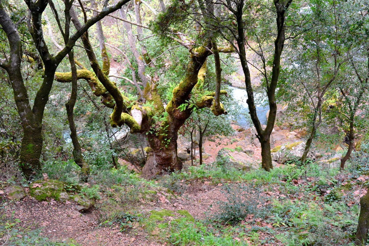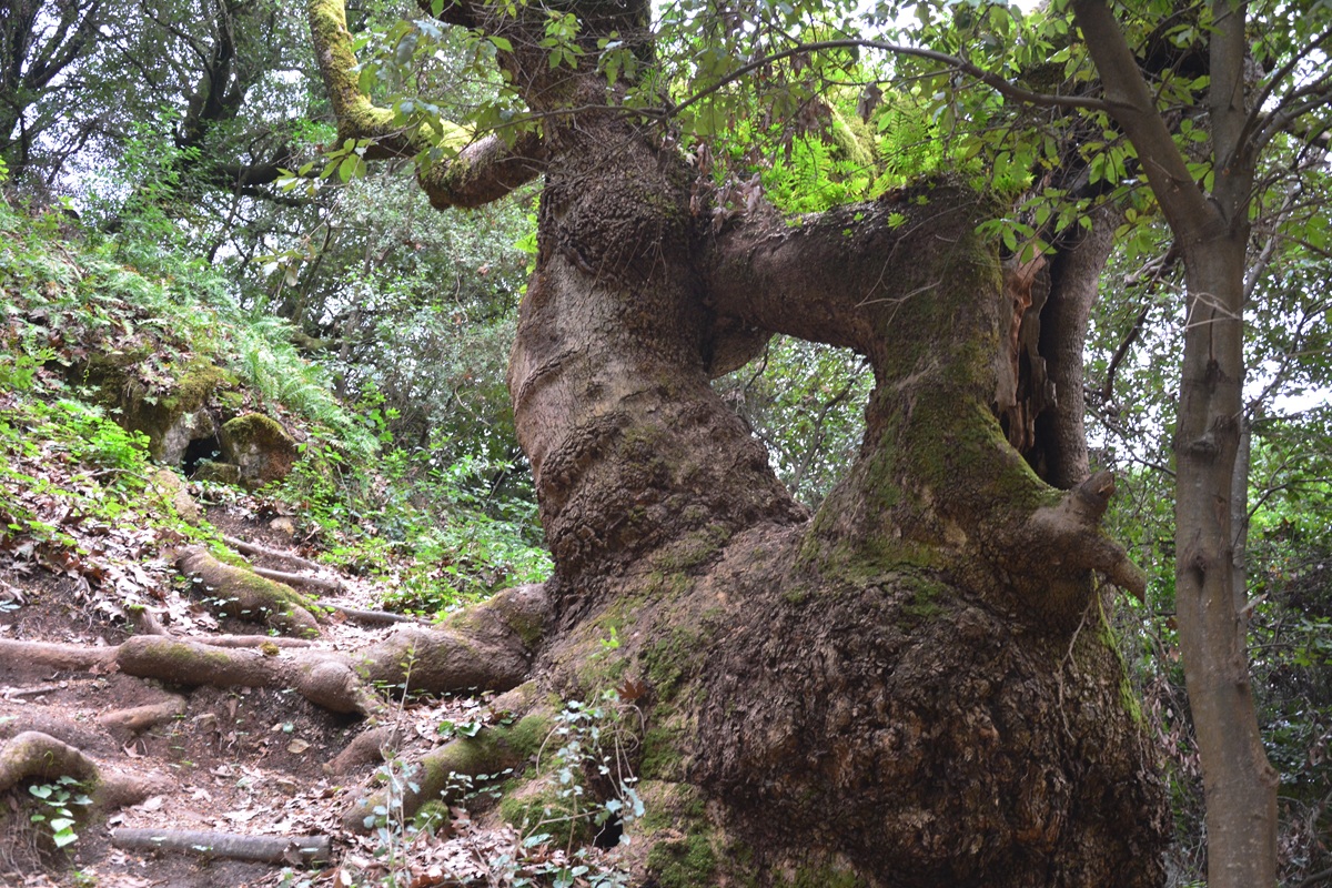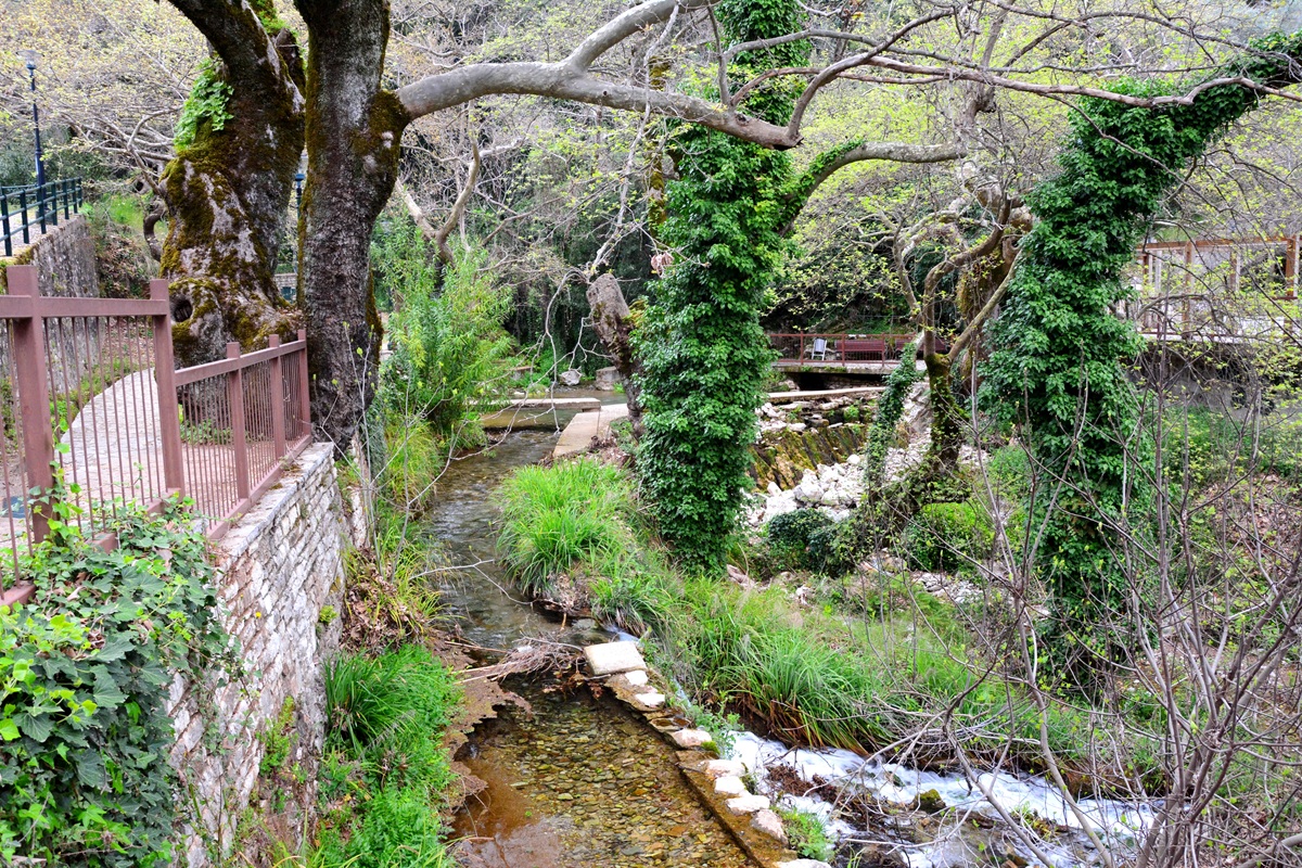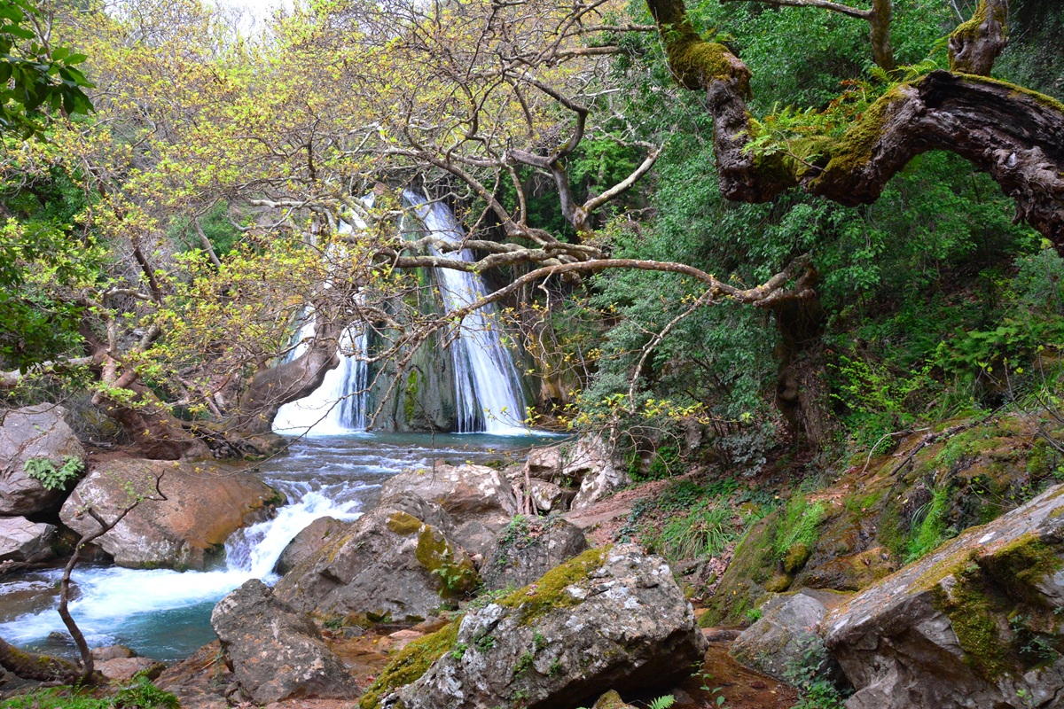 Unten an dem idyllischen Wasserfall stehen uralte Platanen von knorrigem Wuchs. Die Luft ist feucht und kühl und das Wasser in den zwei Gumpen unterhalb der Kaskaden lädt zu einem Bad ein – zumindest im Frühjahr und Frühsommer, solang der Bach ausreichend Wasser führt. Als typischer Karstfluss verkommt auch der Mokistianos-Bach wie so viele in Griechenland im Sommer zu einem müden Rinnsal. Auch früher schon mussten die Mühlen, die einst an seinen Ufern standen, ihren Betrieb dann über viele Monate einstellen.