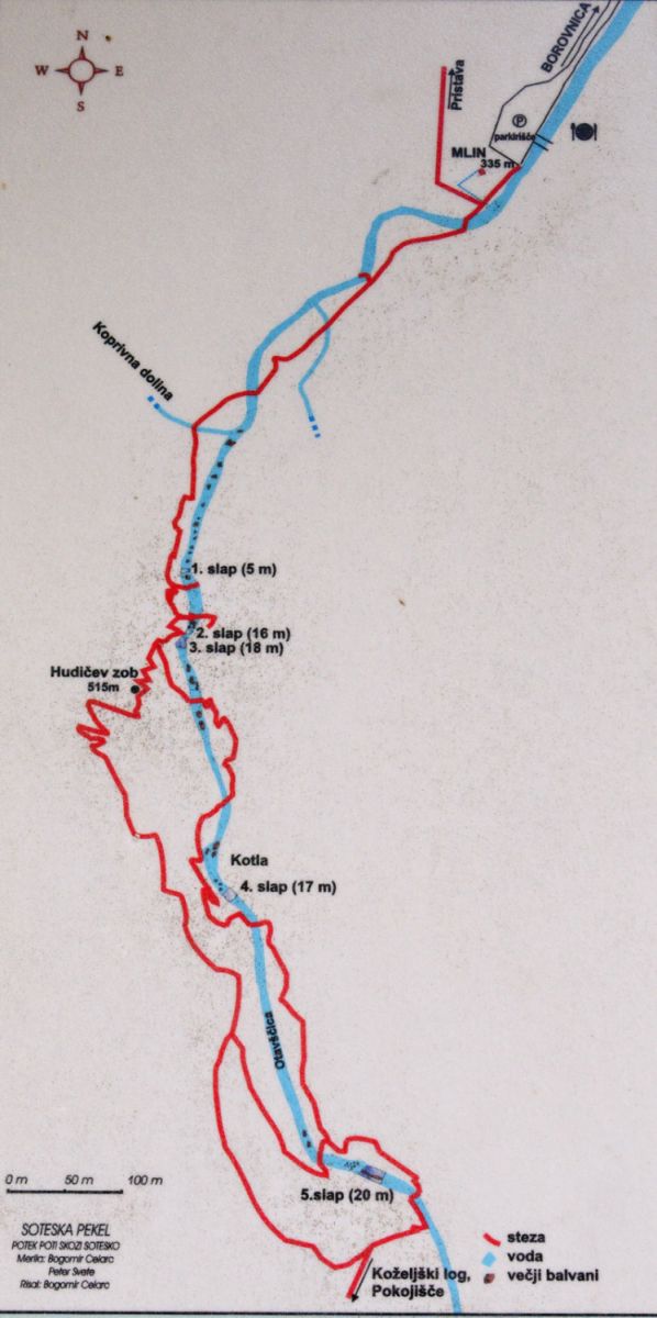 Folgt man der Straße etwa fünf Kilometer weiter nach Süden bis Drazica und dann zu einem Parkplatz (45.890608, 14.371889), so kann man von dort aus eine Wanderung in das wildromantische Tal der Borovniscica mit seinen zahlreichen Wasserfällen unternehmen. Das Tal ist auch bekannt als Soteska Pekel, was so viel wie Höllental bedeutet.