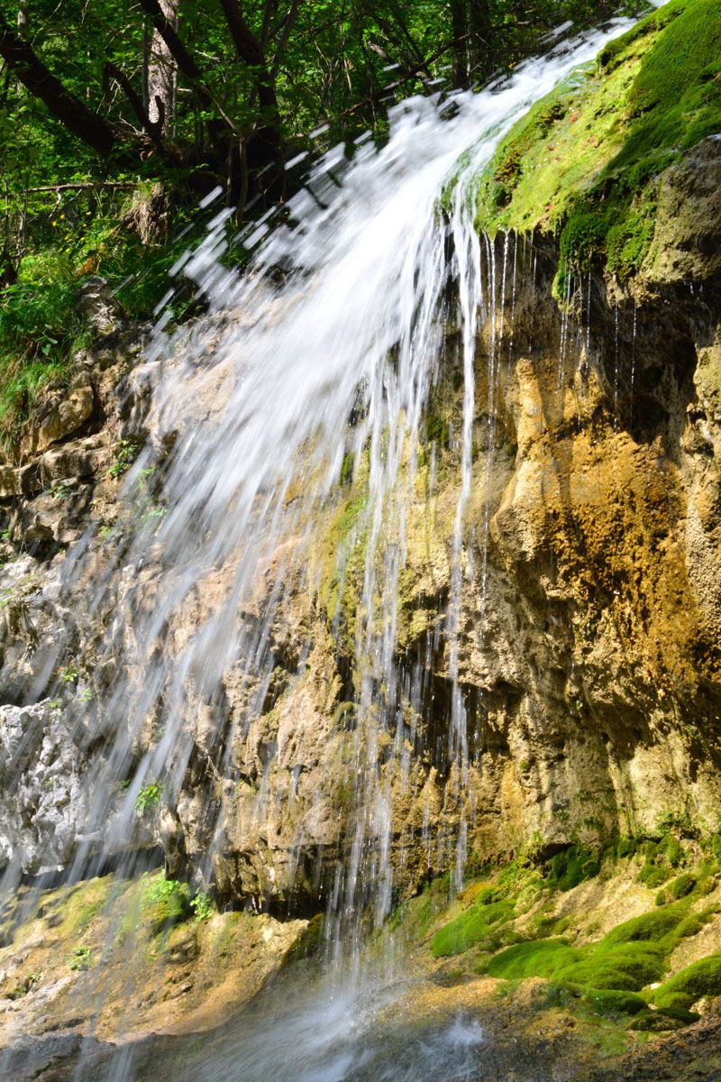 Vom Parkplatz geht man an einer Holzskulptur eines Teufels vorbei in Richtung Schlucht. Der Weg ist zunächst einfach und führt an vielen Strudeln und Becken vorbei, mal auf dieser, dann auf jener Seite des Baches. Der erste größere Wasserfall ist vier Meter hoch. Ab hier ist der Weg nur spärlich markiert, er wird zunehmend steil und kann gefährlich rutschig sein, weshalb er an einigen Stellen mit Seilen gesichert ist. Belohnt wird der erfahrene Wanderer mit einer Reihe knapp 20 hoher Wasserfälle und zahlreicher, stark versinterter Kaskaden.
