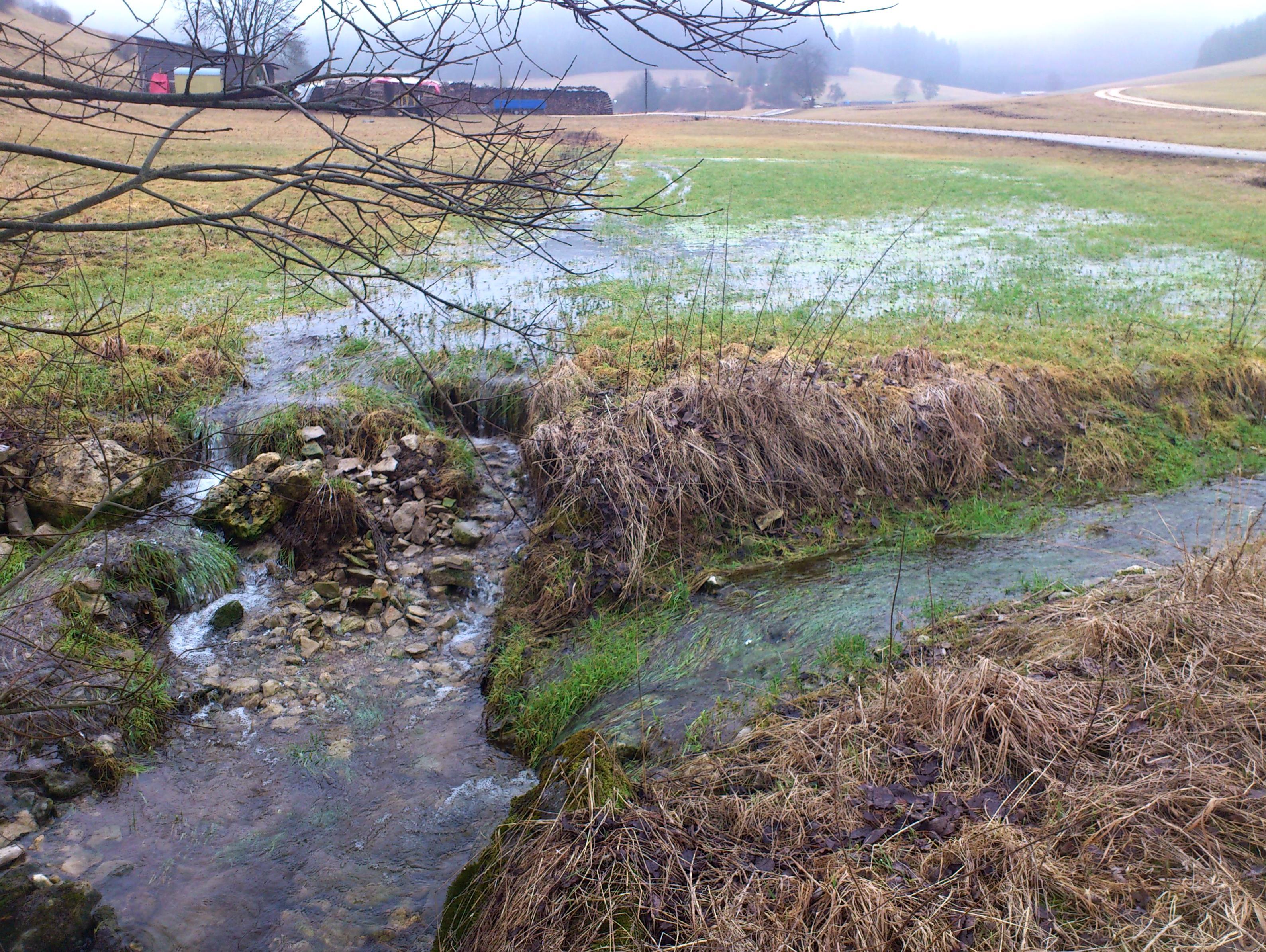 Auch im Umfeld des Hungerbrunnens sprudeln dann zahlreiche Quellen mitten in der Wiese, die zumeist schnell wieder versiegen. Einige sind auch gefasst, im Gelände an ihren Schachtdeckeln erkennbar.