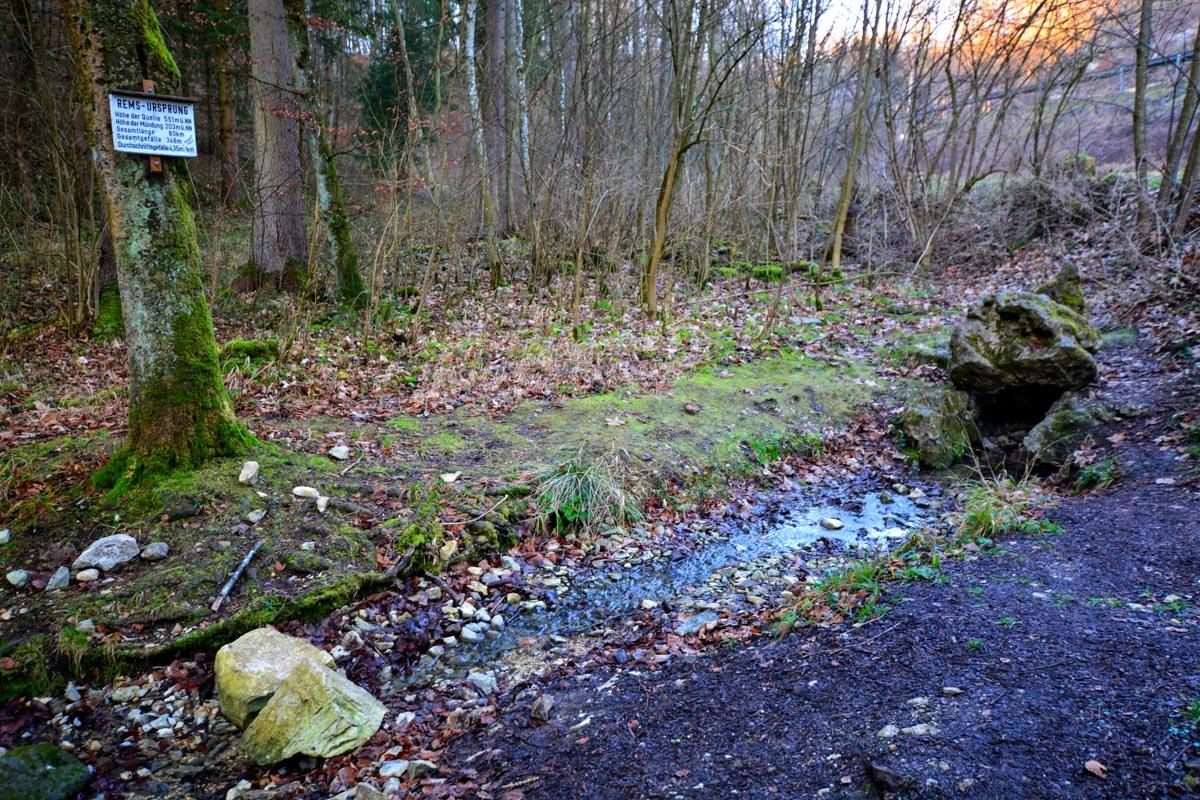 Die auf einer Höhe von 551 m ü. NHN austretende, hübsch gelegene kleine Karstquelle ist der Ursprung des Flusses Rems, der nach 80 km und einer Höhendifferenz von 348 m in den Neckar fließt.