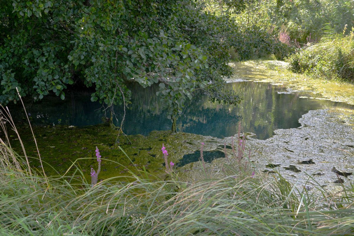 Die Quelle zwischen Castell und Greuth liegt an einem Waldstück nahe der Kreisstraße KT 11. Der Quelltopf ist der Ursprung des etwa 9 km langen Gründleinsbaches, der über den Castellbach in die Schwarzach fließt. Die Quelle entspringt dem Gipsgestein unterhalb des Hahnharts (319 m). Das glasklare Quellwasser kommt aus großer Tiefe und schimmert am Austrittspunkt leicht bläulich. Taucher fanden unter der Austrittsstelle einen mehrere Meter großen, aus dem Kalkstein gewaschenen Hohlraum.