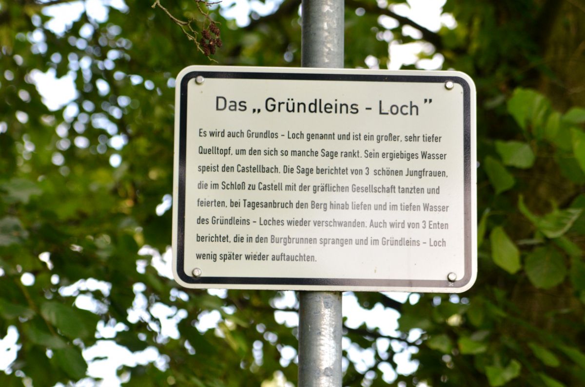 Wie oft zu solch außergewöhnlichen Naturplätzen gibt es auch zum Gründleinsloch alte Sagen - hier aber auffallend viele davon. Etwa besteht danach zwischen dem Brunnen an der Ruine der Castellschen Stammburg auf dem naheliegenden Schlossberg und dem Gründleinsloch ein unterirdischer Gang. Die Sage besagt, dass wenn man eine Ente am Schlossberg in den Brunnen wirft, sie am Gründleinsloch wieder ans Tageslicht kommt. Ganz auszuschließen sind solche unterirdischen Verbindungen in Karstgebieten nie: Nicht selten wurden und werden über die Beobachtungen von Einheimischen unterirdische Zusammenhänge zwischen verschiedenen Wasseraustritten hergestellt, die sich dann - falls dies der Forschung möglich ist - tatsächlich als existent erweisen.
