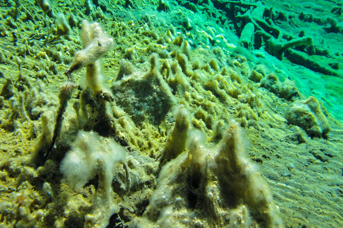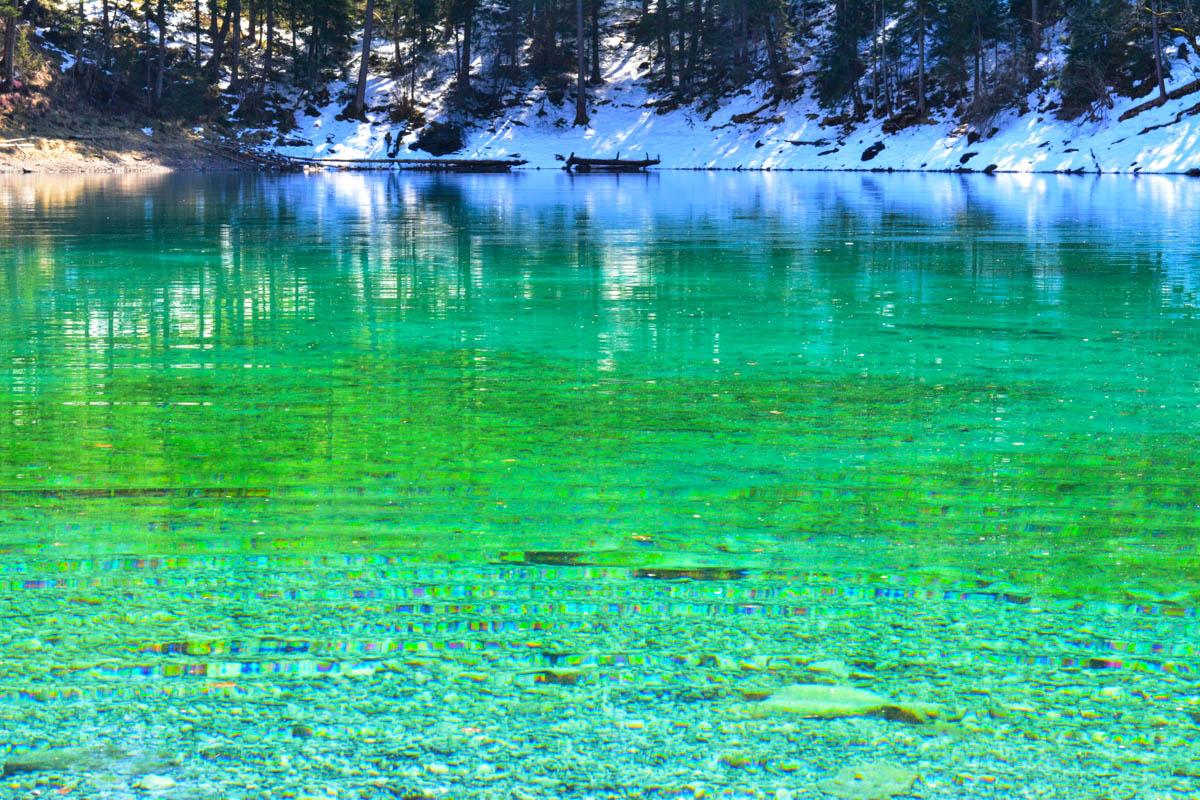 Überzogen sind diese teils versinterten Gehölze mit feinen und empfindlichen hellen Schleimalgen, die auch vom Ufer aus sichtbar sind und die der Szenerie den Charakter einer Märchenlandschaft verleihen. König Ludwig II. von Bayern hatte Schloss Fernstein und die umgebenden Seen deshalb zu seinem liebsten Ausflugsziel erkoren.