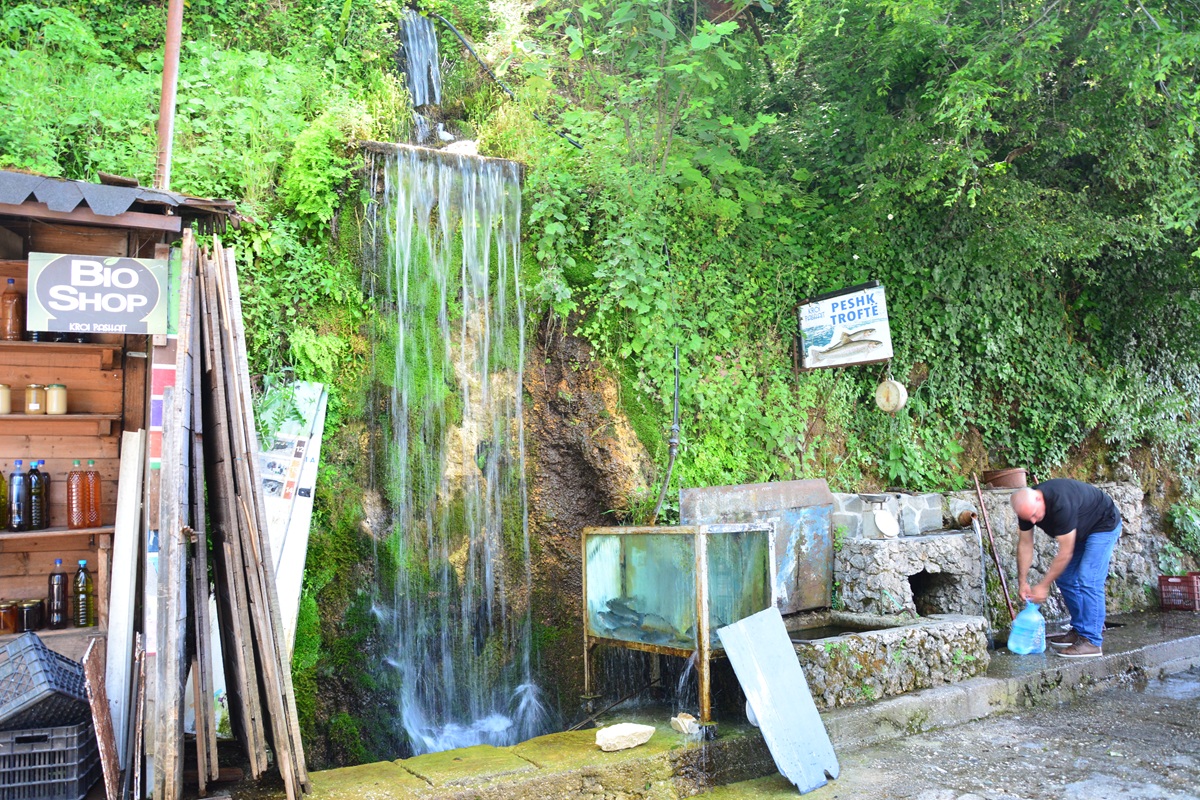 Fährt man auf der SH4 von Tepelene in südlicher Richtung nach Gjirokaster, so verlässt man schon am Ortsrand die Vjosa und fährt weiter am Lumi Drinos, der im griechischen Eprius entspringt, von wo er nach Norden fließt. Nach wenigen Minuten wird es unruhig am Straßenrand, Autos parken, Fußgänger laufen mit Flaschen und Kanistern am Bankett entlang. Verkaufsstände mit Honig, Schleckereien und allerhand Kram reihen sich an Restaurants und Aquarien voller Forellen. Manchmal herrscht ein solcher Trubel hier, dass die Polizei den Verkehr regeln muss. Man ist in Uji i Ftohte, übersetzt beim „kalten Wasser“, das dem ausländischen Touristen unbekannt, jedem Albanern aber ein Begriff ist.