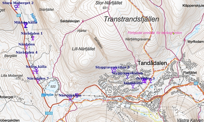 Zu welchen der zahlreichen Quellen am Fuß des Naturschutzgebiet Norra Transstrandfjällen man sich weglos durchschlagen kann, hängt davon ab, wie nass der Boden ist und welche Ausrüstung man hat. Ohne Gummistiefel bekommt man jedenfalls nasse Füße. Doch bieten einige durch ihre geringe Entfernung von Wegen und Straße die seltene Gelegenheit, die typischen Moor- und Sumpfquellen Schwedens und ihre Bäche näher kennenzulernen. Ihre Lage ist auf der geologischen Karte SGU (https://apps.sgu.se/kartvisare/kartvisare-kallor.html) in den meisten Fällen recht exakt niedergelegt und mit einem linken Mausklick auf die jeweilige Quelle erhält man meistens auch weitere Informationen.
