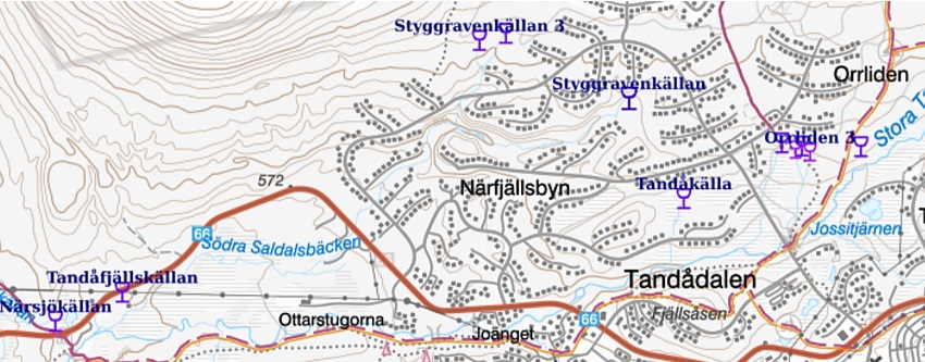 Einen vergleichsweise guten Zugang zu einigen dieser Quellen hat man in dem weitläufigen Ort, der mit seinem Straßennetz die Ferienhäuser erschließt, die am Fuß des Naturschutzgebietes ansteigen. Die Wanderwege verlaufen auf Bohlen in der sumpfig moorigen Niederung am Fluss Stora Tandan, der alles Wasser sammelt. Wie in Schweden üblich führen die Pfade allerdings nicht direkt zu den Quellen, sondern mit einigem Abstand an ihnen vorbei.