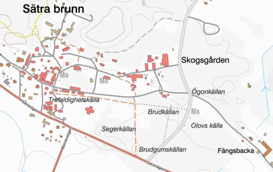 Zwei von Sagen umrankte Quellen (59.860367, 16.458083; lässt sich das mit Quellenkarte verlinken?) findet man unweit des Hotelparkplatzes am Urban Hjärnes väg. Besonders interessant ist ein großer „Schalenstein“ auf einer Felskuppe, ein Wasserbecken, das niemals austrocknet. Ob es von Grundwasser gespeist wird, das durch Risse im Grundgestein aufsteigt, oder von Regenwasser, ist - wie bei den meisten dieser Schalensteine - ungeklärt. In vorchristlicher Zeit waren viele von ihnen Ritualplätze. Auch in Sätra weisen alte Münzfunde darauf hin, dass es sich um eine frühere Opferquelle handelt. In christlicher Zeit wurde alte Ritualquellen oft zu „Augenquellen“ (Ögonkällan) umgewidmet, mit deren Wasser sich Gläubige die Augen spülten, um mit Hilfe ihres Glaubens die Sehkraft zu verbessern und das „innere Auge“ sehend zu machen. Unterhalb dieses Schalensteins liegt die Brudkällan (Brautquelle), die eine so hohe Ergiebigkeit hat, dass ihr Wasser für therapeutische Anwendungen genutzt werden konnte.