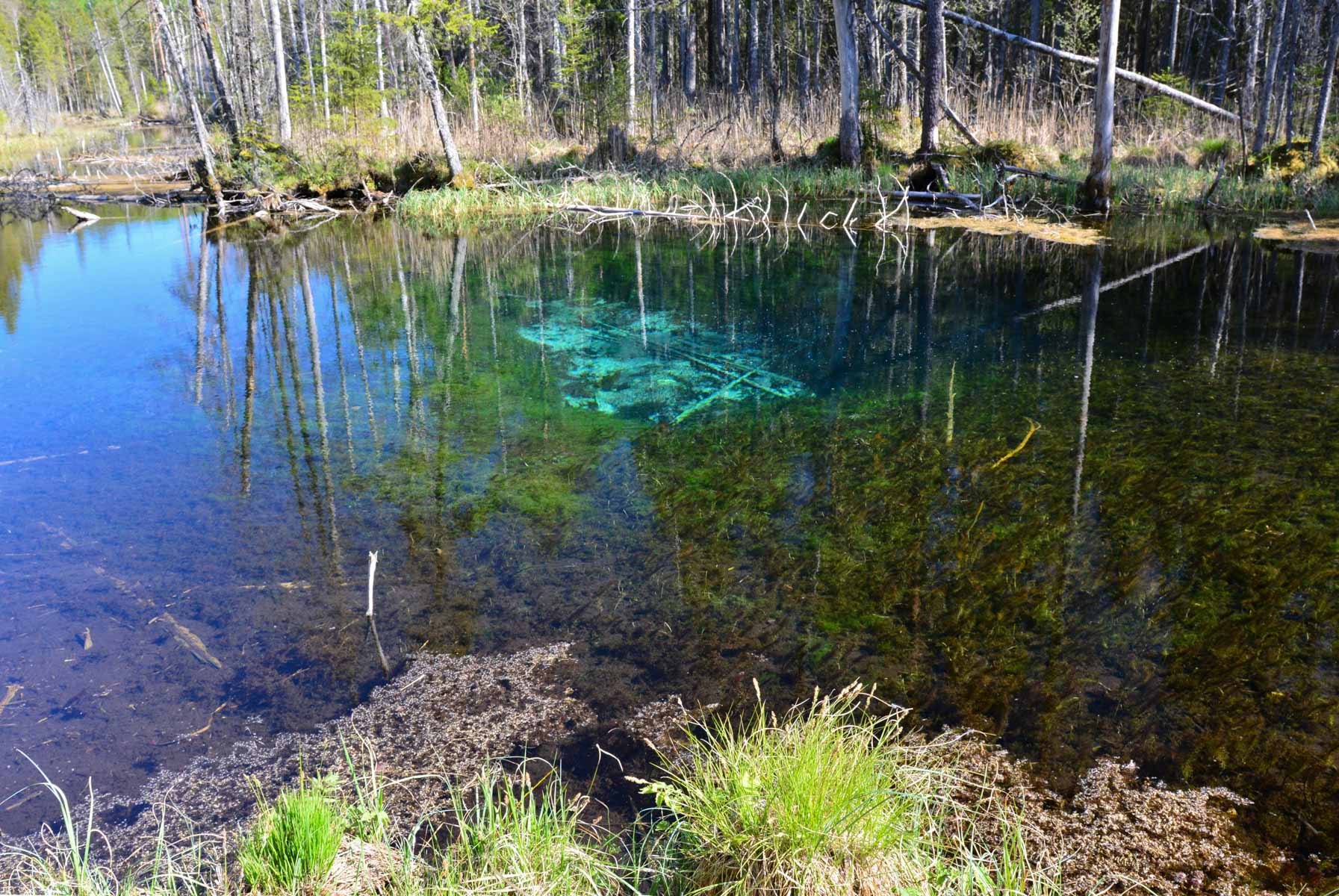 Überwiegend entspringt das Wasser großen Limnokrenen, deren Art von großflächigen und flachen Tümpeln mit steinigem Grund bis hin zu kleinen, metertiefen Moorlöchern reicht. Viele der Wasseraustritte bilden Sandvulkane, die aus dem karstigen Untergrund hellen Sand und Kalkschlamm austragen. Man erkennt diese Stellen an einer hellen türkisfarbenen Färbung in den zumeist moorig-dunklen Betten der Gewässer. In diesen Bereichen gedeihen kaum Wasserpflanzen, während sich andernorts vielfach dichte Pflanzenteppiche ansiedeln konnten.