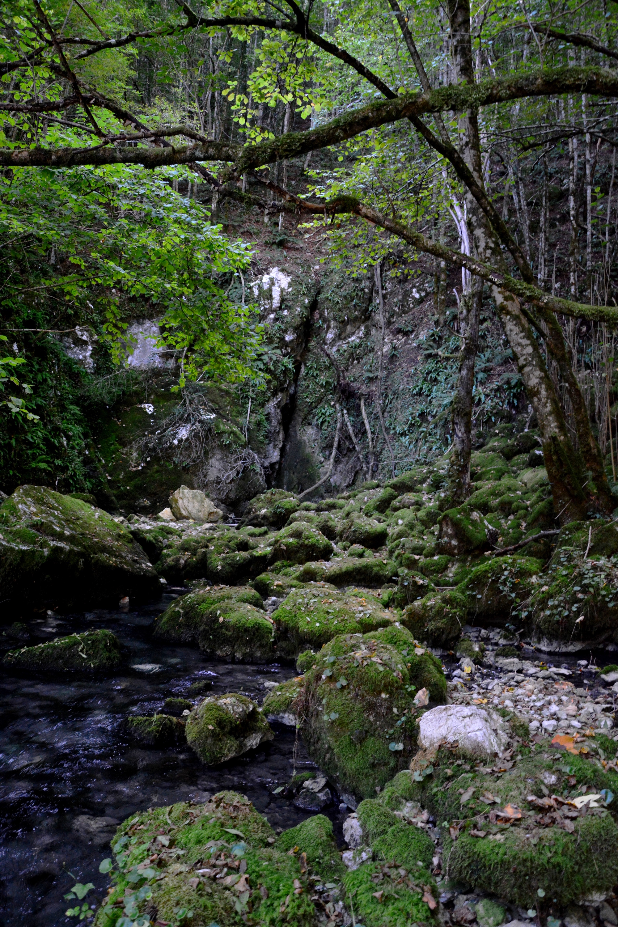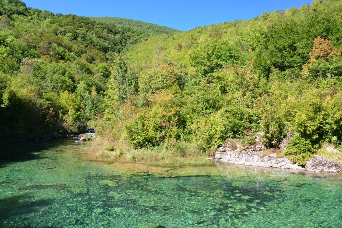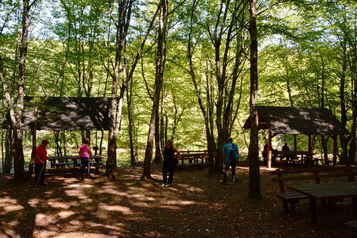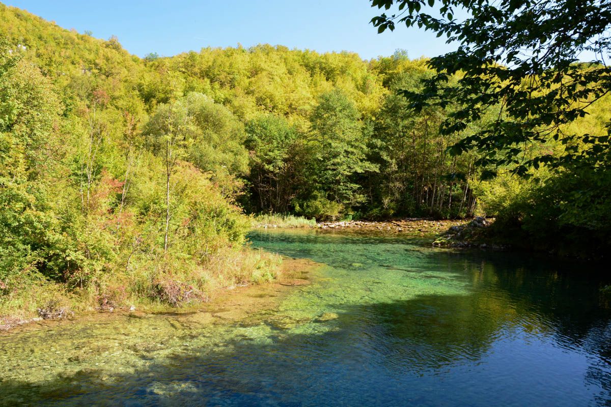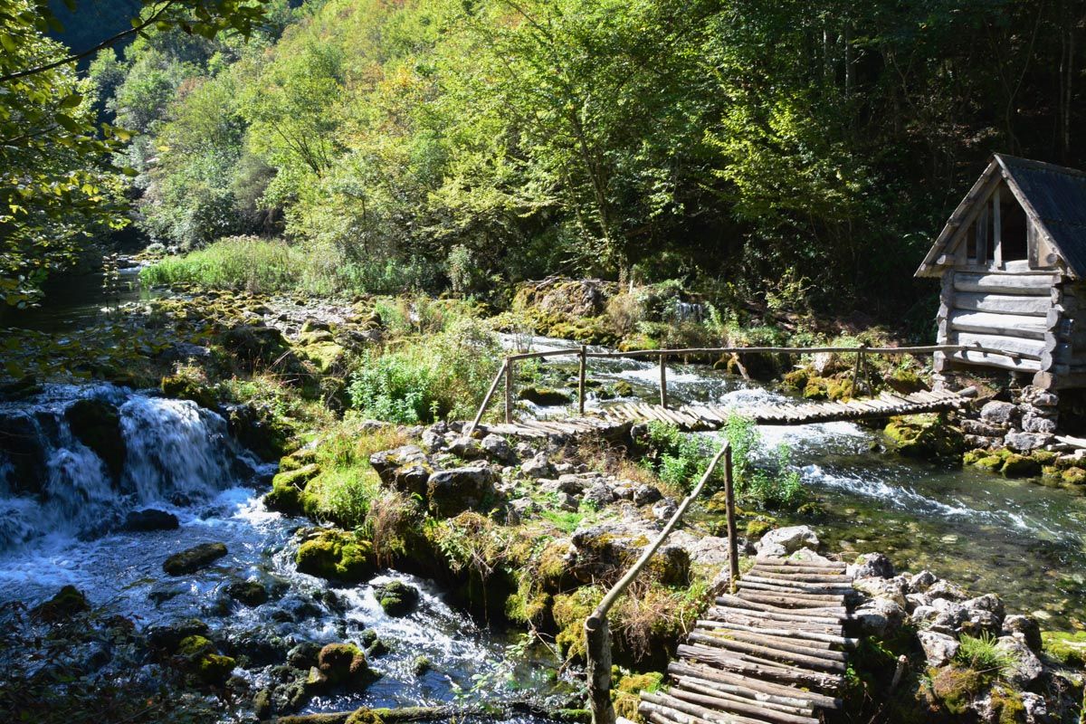 Der Abzweig zur östlichen Quelle Suvo Vrelo, der beschildert ist, lohnt nur wenn die Quellen genügend Wasser führen. Im Hochsommer fällt diese Quelle mitunter ganz trocken. Der Weg zu den beiden anderen Quellen führt von einem hübschen Picknick-Areal aus auf Pfaden in südliche Richtung auf die Felswand zu, die ganzjährig beschattet ist.
