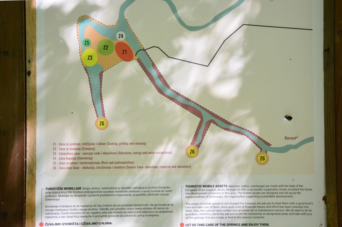 Am einfachsten lassen sich die Sana-Quellen (Quelle 1, Quelle 2, Quelle 3) von der Ortschaft Donji Baraci erreichen. Die einspurige Straße in Richtung Westen ist wegen des sehr geringen Verkehrs knapp auch für Wohnmobile fahrbar - jedenfalls sofern man gewillt und in der Lage ist, auch mal ein ordentliches Stück rückwärts zur nächsten Ausweichstelle zu fahren. Der Weg führt vorbei an dem sympathischen Pecka Visitor Center (44.319993, 16.903929), dem man einen kurzen Kennenlernbesuch abstatten kann. Gut zwei Kilometer vor den Quellen kann man an einer Abzweigung den Wagen abstellen (44.319729, 16.860917) und zu Fuß weitergehen. Der Weg bergab führt zunächst auf einer Schotterstraße und dann auf einem Pfad.