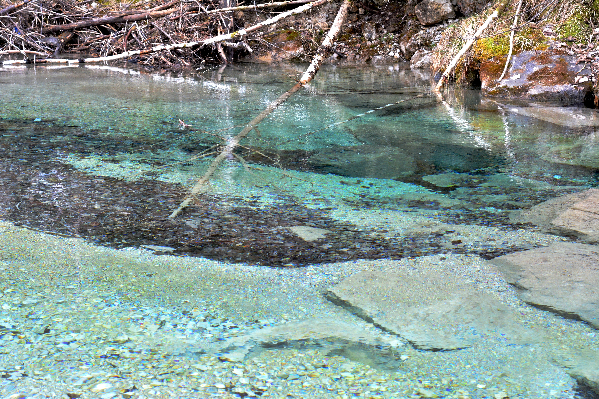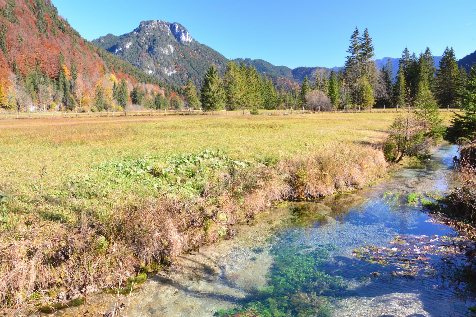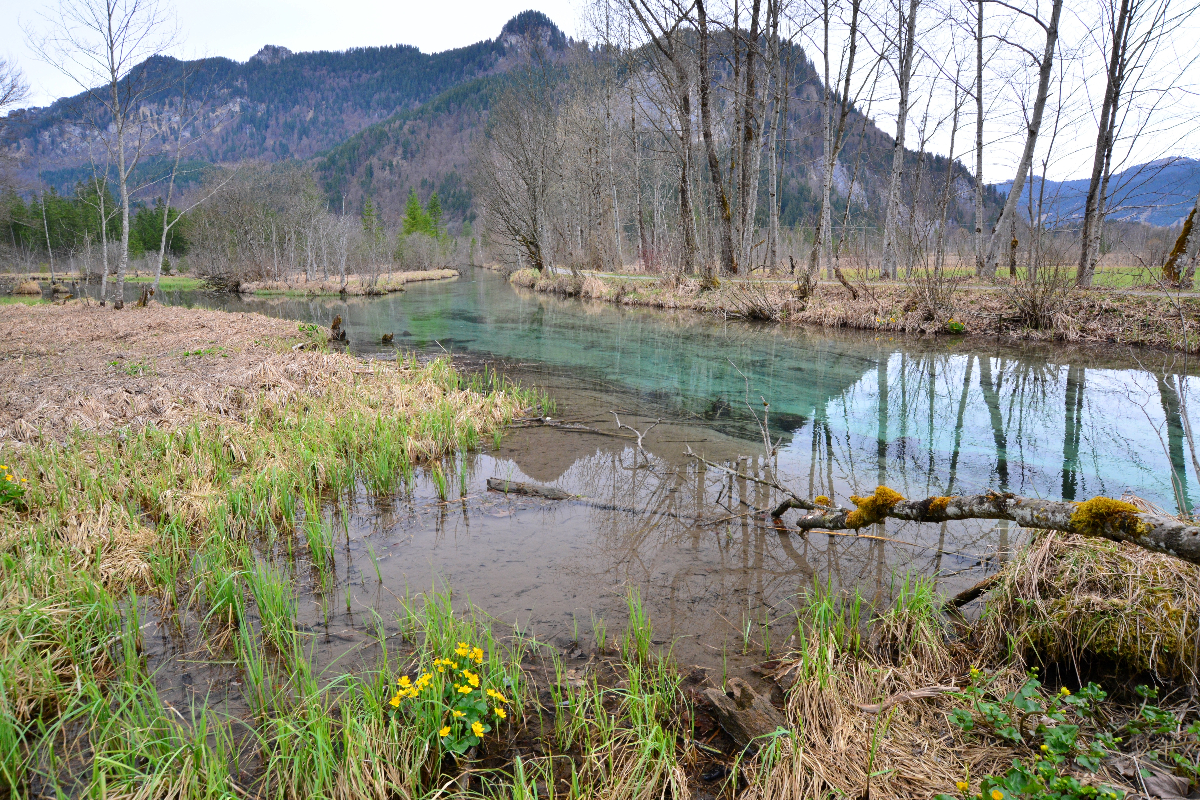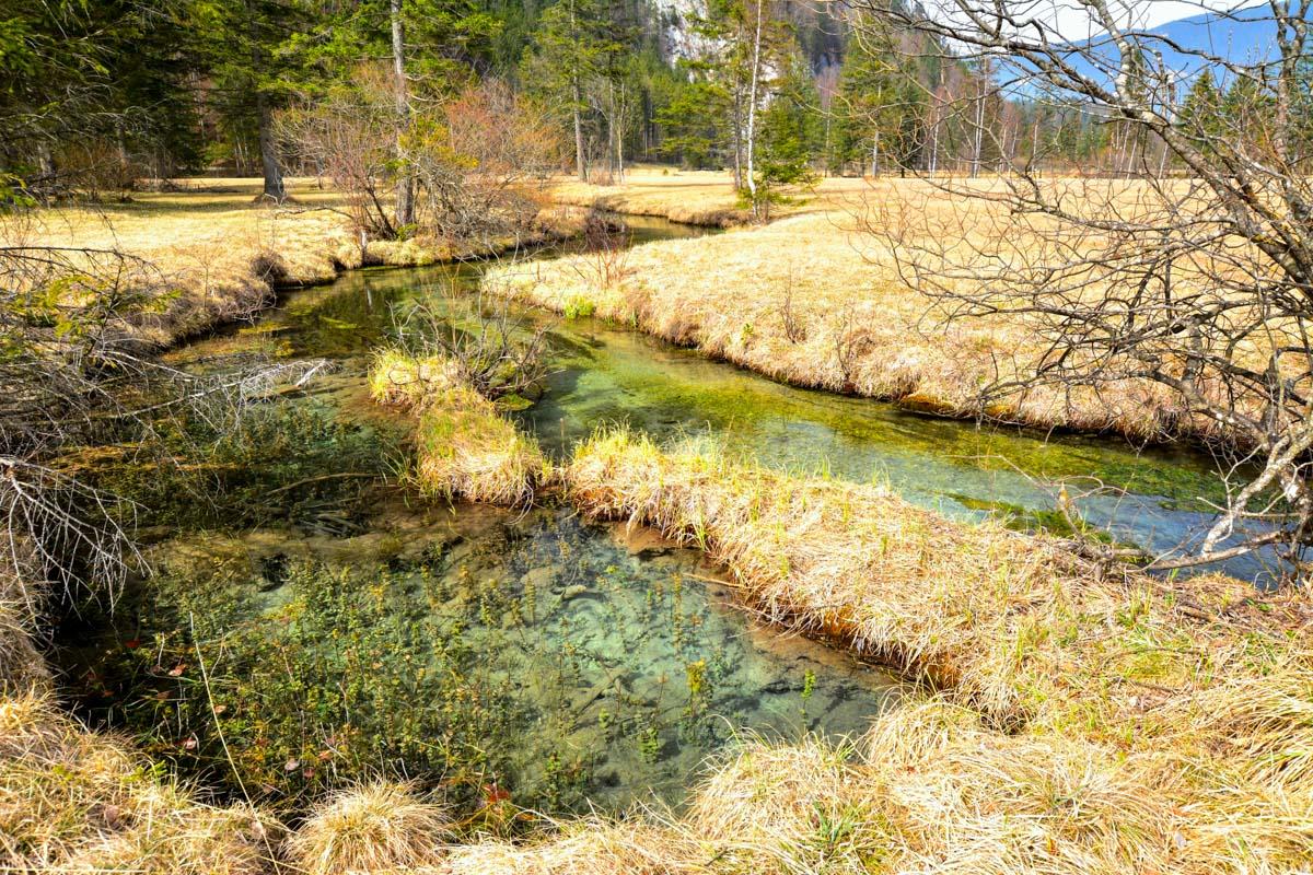 Bei den Quellen der kleinen Ammer nördlich der Straße handelt es sich ganz überwiegend um Limnokrenen, die sowohl den Ursprung eines Quellarms bilden wie auch aus tiefen Löchern am Grund der Wasserläufe aufsteigen und dabei unablässig kleine Gasblasen bilden. Die Färbung des Wassers und der reiche Pflanzenbewuchs bezaubern vor allem bei Sonnenschein.