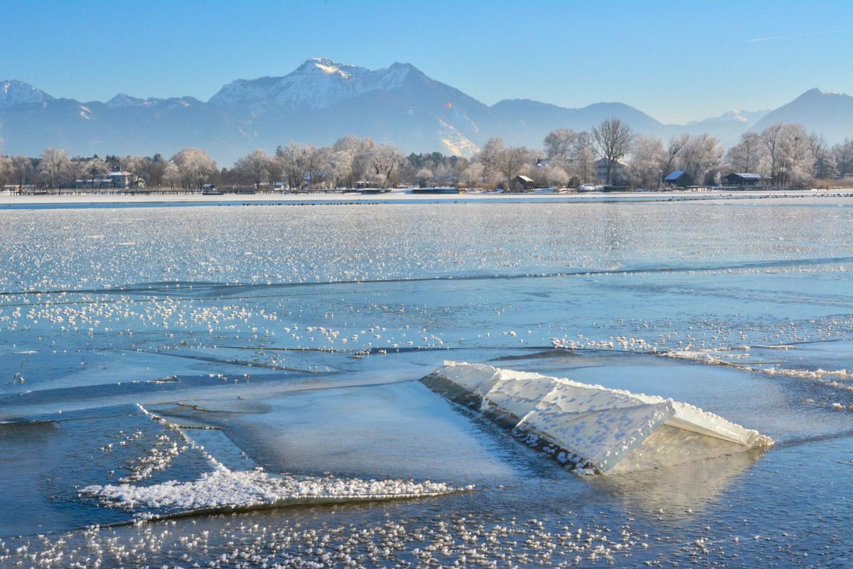 Oder vielleicht bietet der kommende Winter noch einmal Temperaturen, die das Wasser entlang der Seeufer gefrieren lassen, so wie zuletzt 2017? Dann verlangsamt sich der Rhythmus des Sees und seiner Bewohner, die Fotomotive werden geduldiger. Wanderungen an den schönsten Abschnitten im Norden und Osten des Sees oder am Ufer der Halbinsel Feldwies erschließen dann wunderbare Blicke über Eis und Schnee. Vogelfreunde finden in den Verlandungszonen Achendelta und Irschener Winkel in Bernau Aussichtstürme, an denen sie mit Fernrohr und Teleobjektiv ausharren können. Vielleicht friert der See ja noch einmal so weit zu, dass man die Inseln zu Fuß erreichen kann, wie 2006? Winter wie 1941/42, als Panzer über den „weiten See“ fuhren, wird man vermutlich auf absehbare Zeit nicht mehr erleben ...