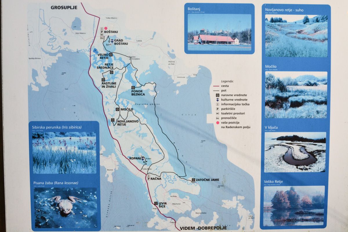 Als Ausgangspunkt für Unternehmungen im Polje kann der Parkplatz an der Kirche St. Martin (45.934818, 14.675764) gewählt werden, der sich auch als Stellplatz für Wohnmobile gut eignet. Naturfreunde werden keine Mühe haben, in dem Gebiet einen ganzen Tag zu verbringen. Im Sommer kann man es auf einem Feldweg in nordsüdlicher Richtung durchqueren, der sich auch gut für Fahrräder eignet. Besonders schön ist es aber, mit genügend Zeit über die Wiesen zu wandern, den Betten der Wasserabläufe zu folgen und dabei dieses und jenes beeindruckende Ponor in der offenen Landschaft zu finden. Viele der Wassertümpel sind hingegen mit so starken Schilfgürteln umgeben, dass man kaum etwas von ihnen zu sehen bekommt. Wer Wasservögel beobachten möchte, bekommt diese am besten in den Tümpeln unterhalb der Burgruine Grad Bostanj zu sehen. Unbedingt ansehen sollte man sich die Höhle Zatocna, am besten ausgestattet mit einer Taschenlampe, damit man den in ihr laufenden unterirdischen Fluss nicht nur zu hören, sondern auch zu sehen bekommt. Wer möchte, kann von hier aus den Weg zurück nach Norden durch den Wald am Ostrand des Poljes nehmen.