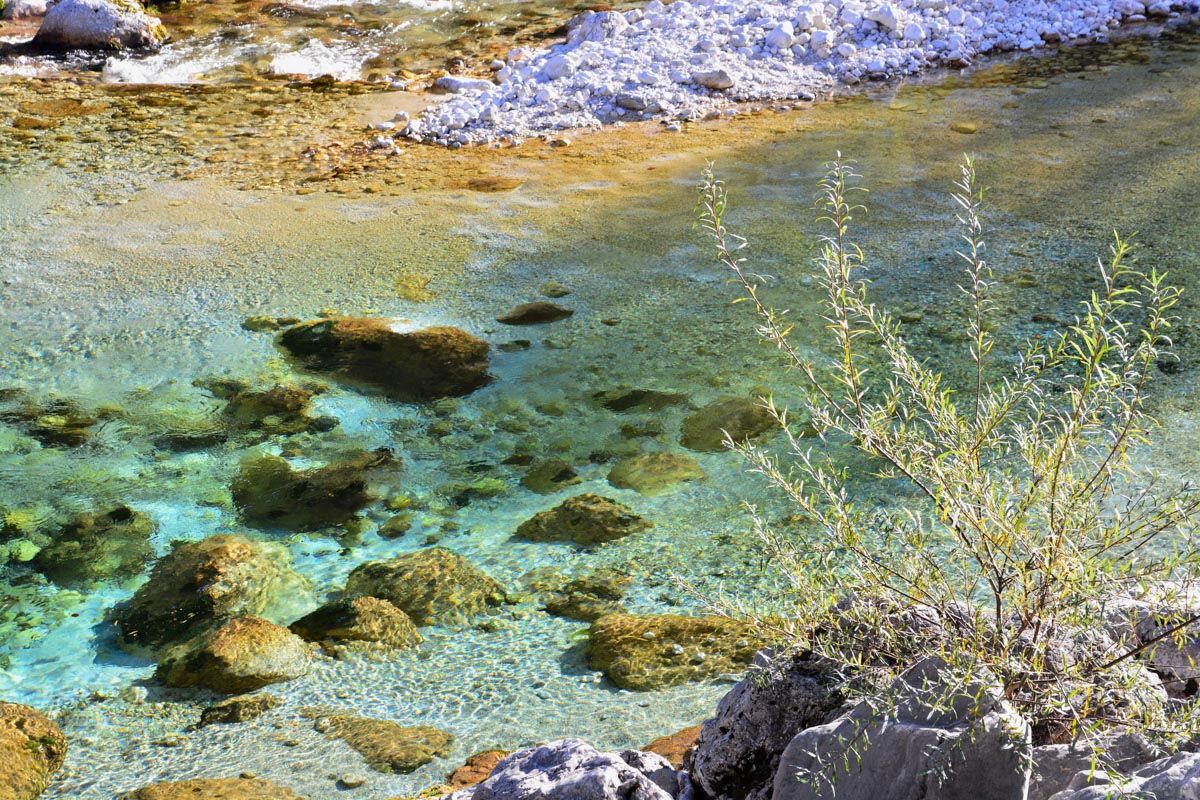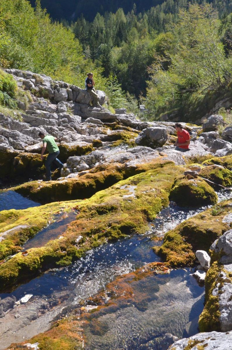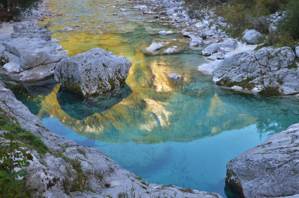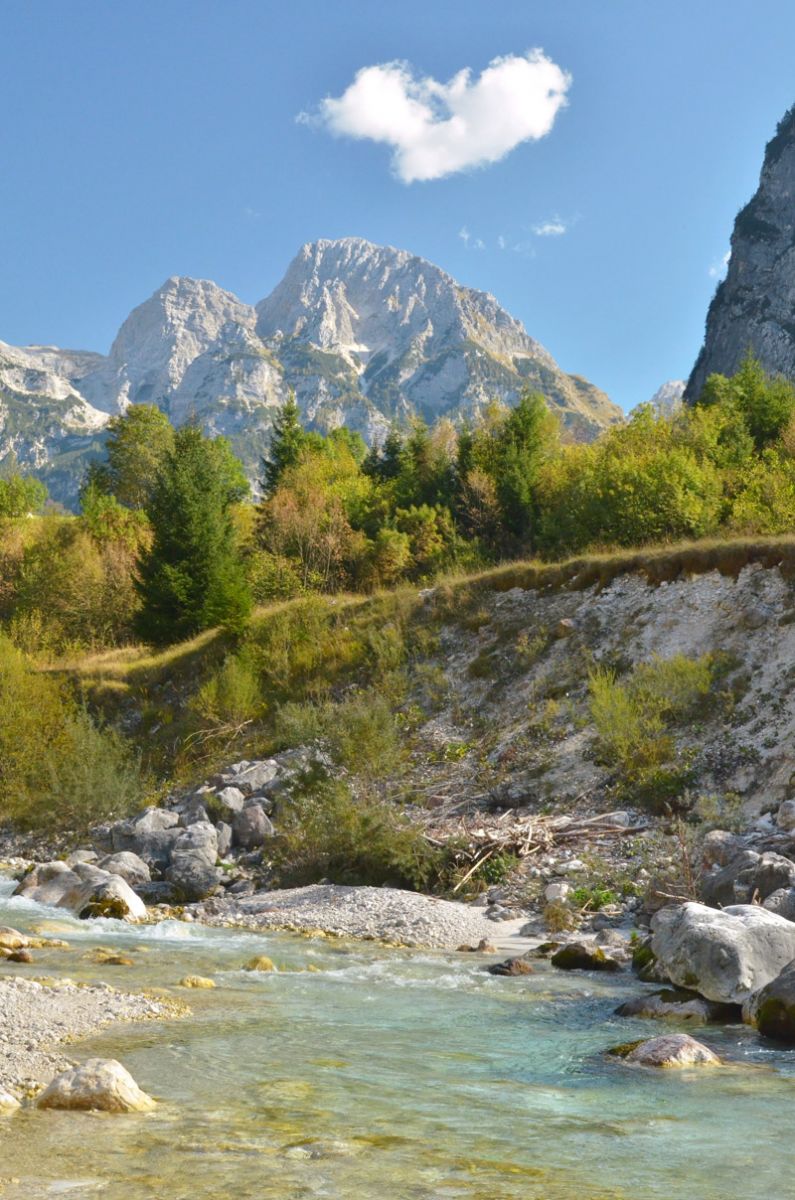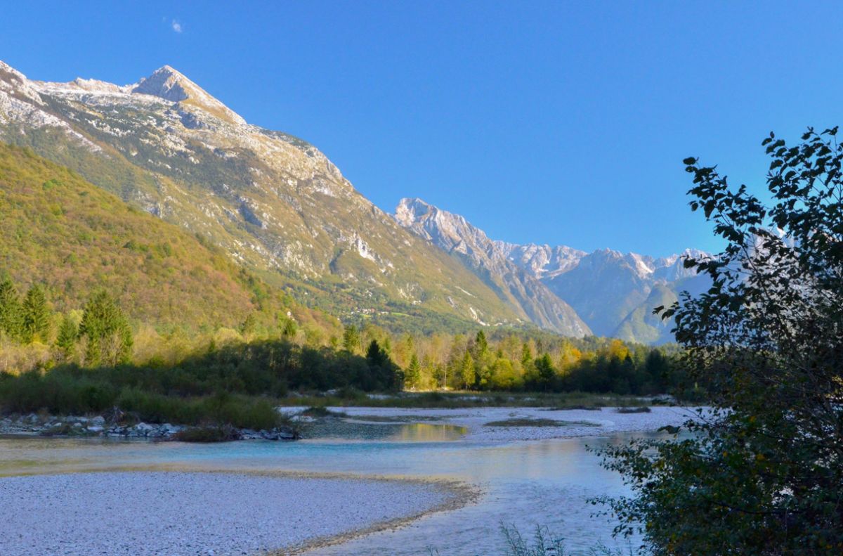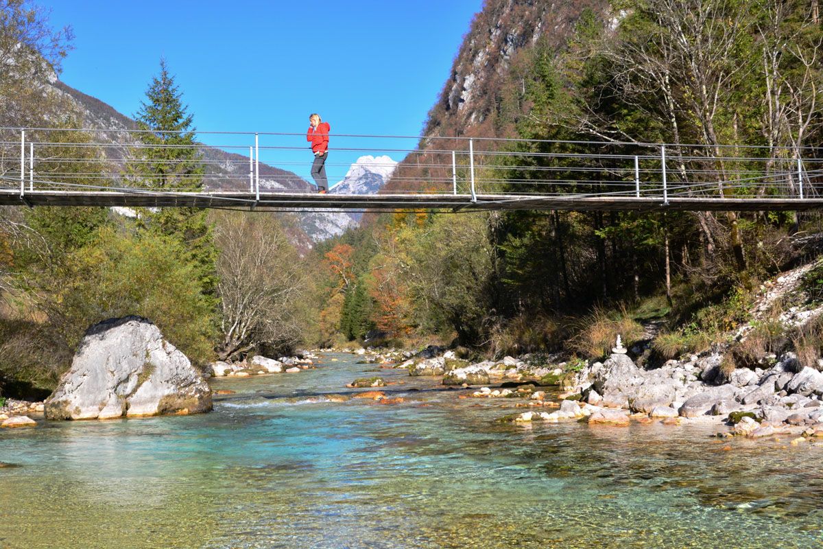 Bereits von hier oben kann man dem gut ausgebauten und bekannten Soca-Trail entlang des Flusses folgen, der Teil des Weitwanderweges Alpe-Adria ist. Der vielleicht schönste Teil des insgesamt 85 Kilometer langen Weges folgt der Soca zwischen Trenta und Bovec auf 22 Kilometer. Der örtliche Nahverkehr hat sich auf die Bedürfnisse der Wanderer eingestellt und bietet in der Saison regelmäßige Verbindungen an. So kann man die teilweise recht langen Etappen jederzeit unterbrechen und sich viel Zeit nehmen für die wunderbaren Blicke, die sich immer wieder auftun.