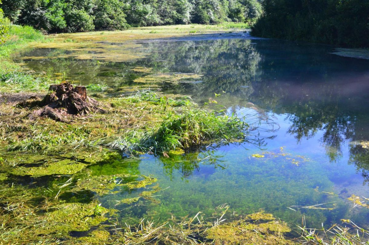 Die obersten der Quellen bilden zunächst einen Teich, der sich durch weitere Zuflüsse zu einem breiten Wasserlauf ausweitet. In dem petrolfarben schimmernden Wasser sieht man da und dort Gasblasen aufsteigen und wirbelnde Sedimente, welche die Wasseraustritte am Grund des jungen Flusses markieren. Wer das Gebiet der oberen Quelle weglos (und widerrechtlich) betritt, sollte das ausdrücklich nur außerhalb der Brutzeiten tun, keine Hunde mitführen und sich ruhig verhalten.
