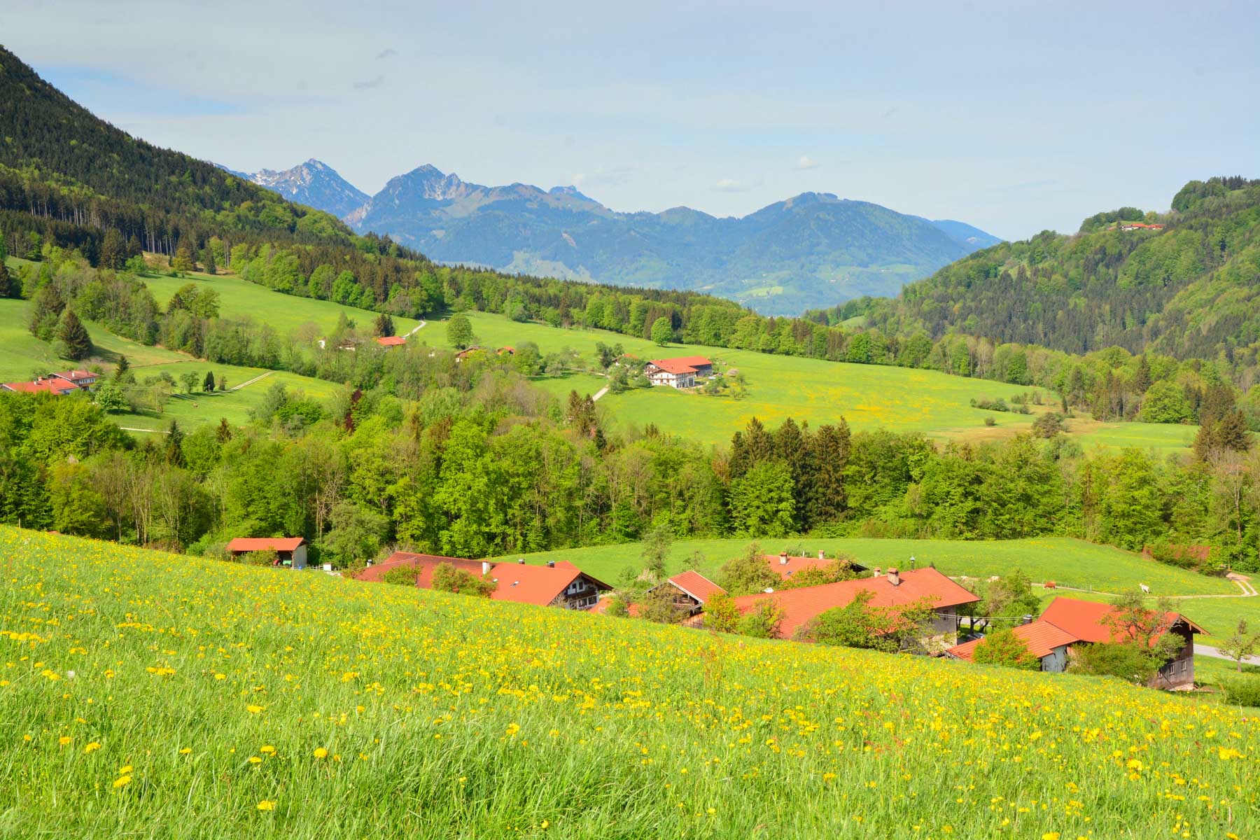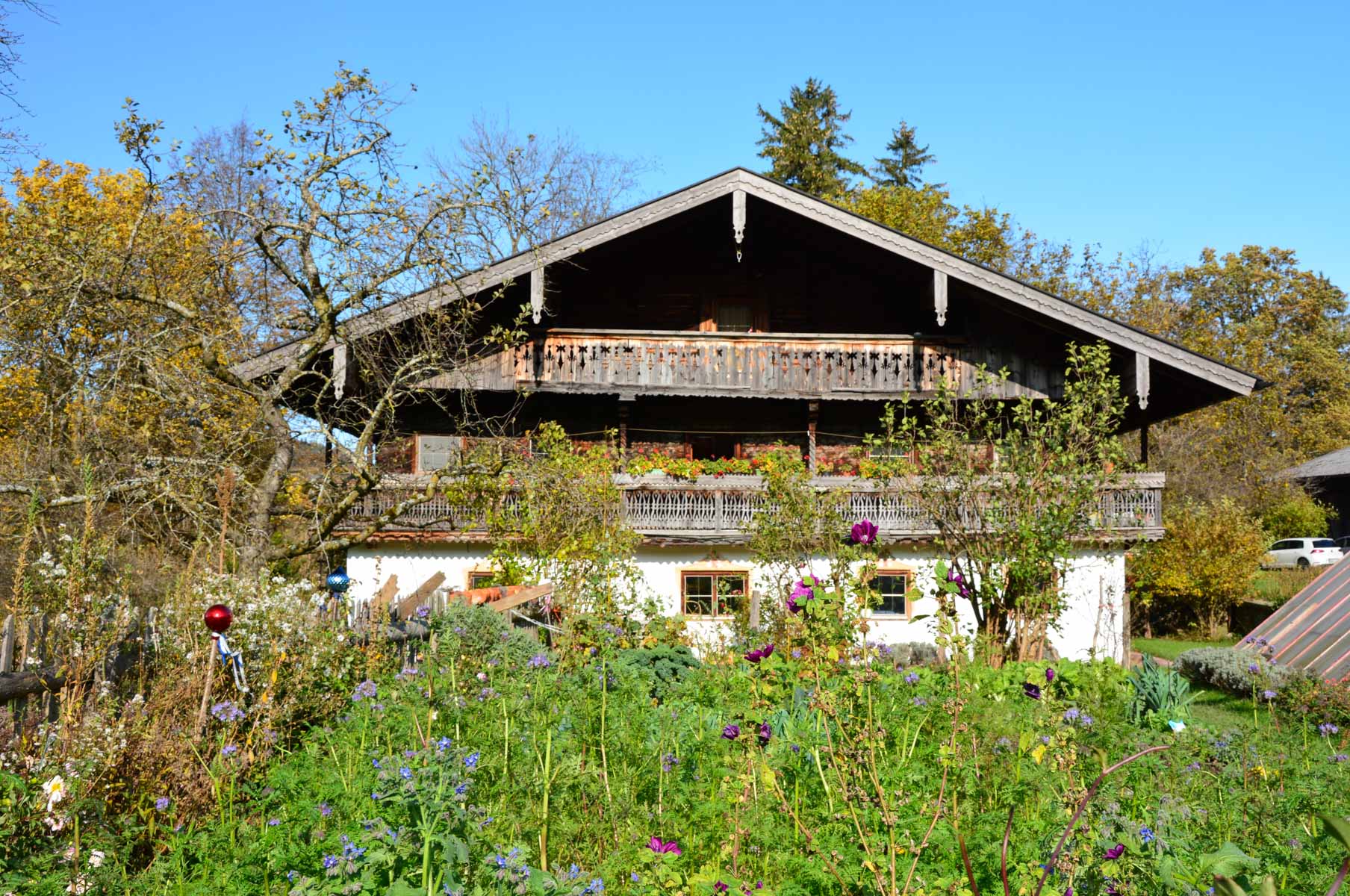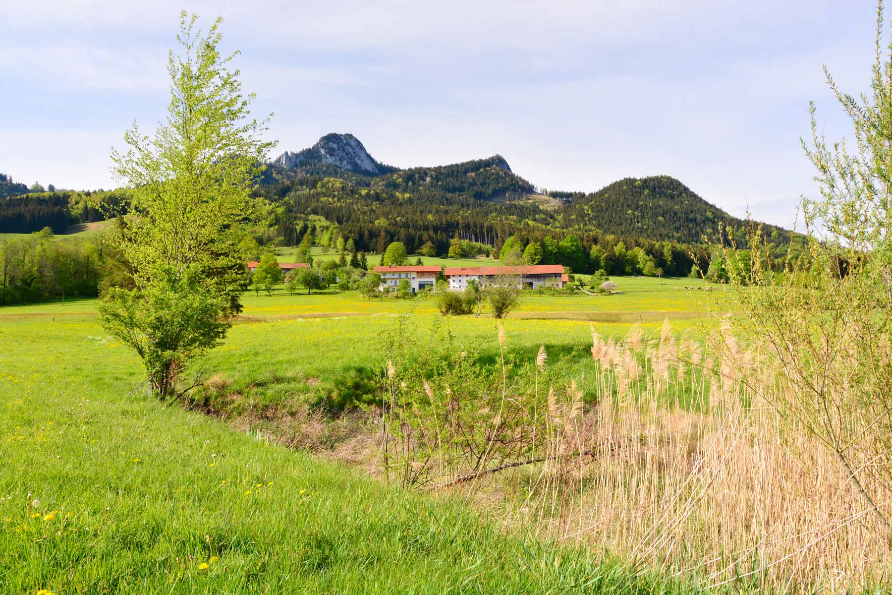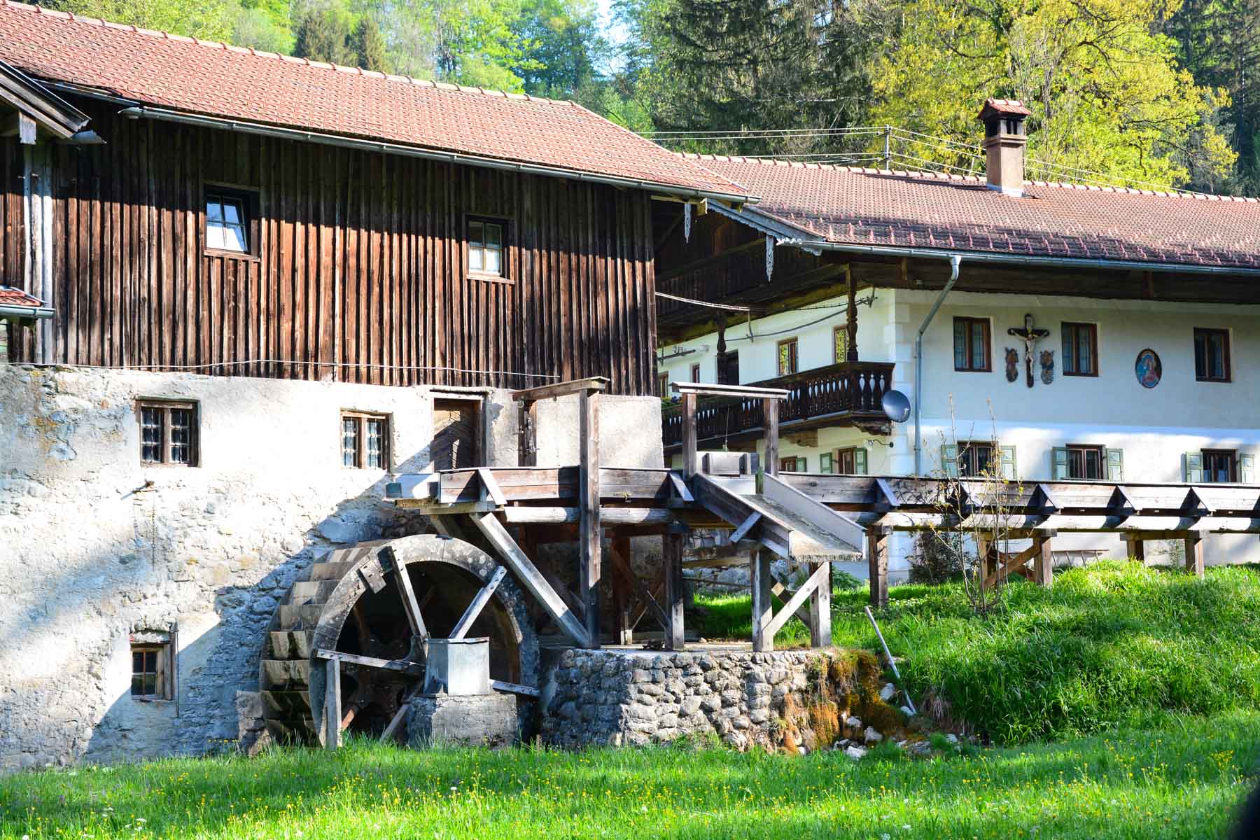 Vorbei an der Enzianwiese kann man den Rückweg auf der zwar geteerten, aber ruhigen Straße durch das sehr schöne Mühltal am Steinbach nehmen. Sie führt vorbei an einem kleinen E-Werk (47.749901, 12.198822), das seit 1919 von Bewohnern des Samerbergs genossenschaftlich betrieben wird, und an einer alten Mühle (47.748835, 12.189855).