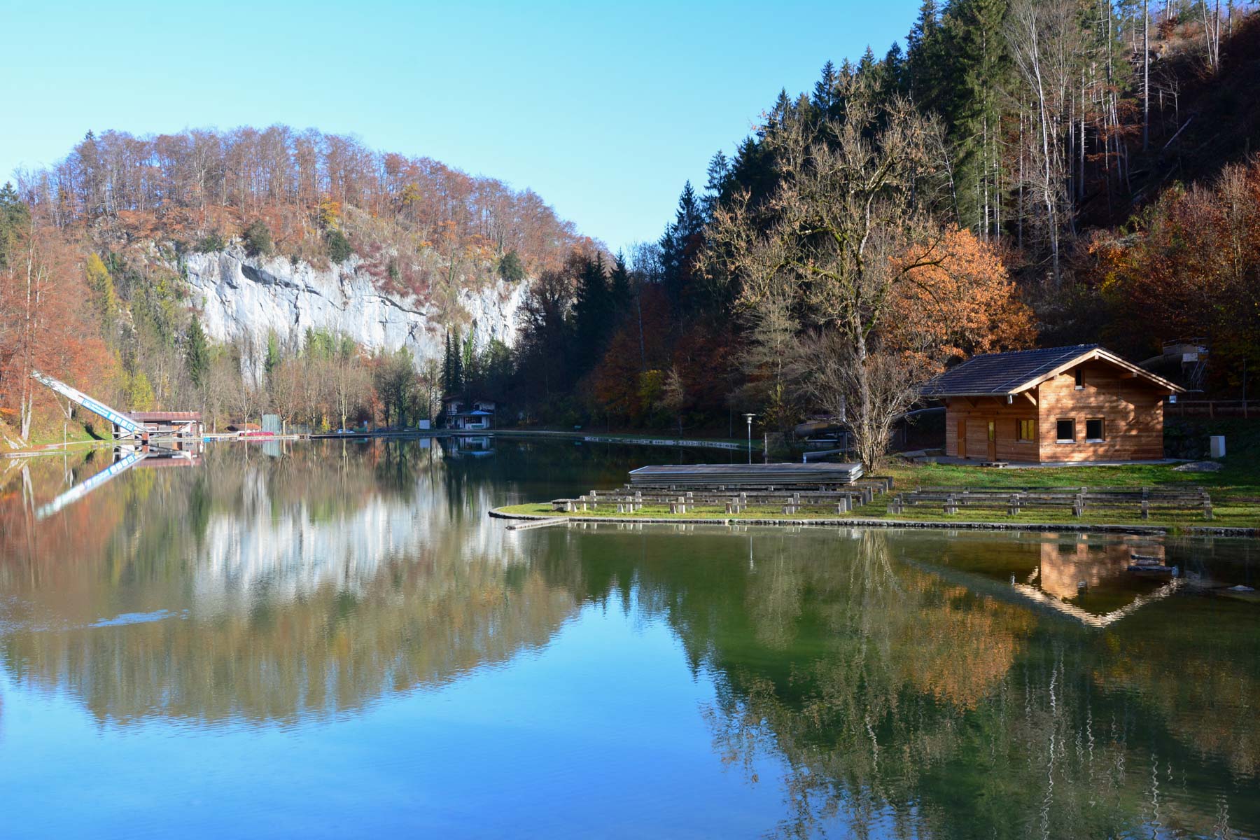 Wer sich den Aufstieg nicht zutraut, kann direkt über die historische Gfallermühle, in der später ein Gasthof betrieben wurde, weiterwandern hoch zum Gfaller Stausee. An dessen südlichem Ufer treten auf eine Länge von 600 Metern etwa 15 Quellen direkt neben dem ebenen Weg aus. Die meisten von ihnen führen ganzjährig Wasser. Ein so ausgeprägter Quellsaum lässt sich in Bayern nur selten beobachten, etwa auch bei den Quellen am Tuffberg Vagen.