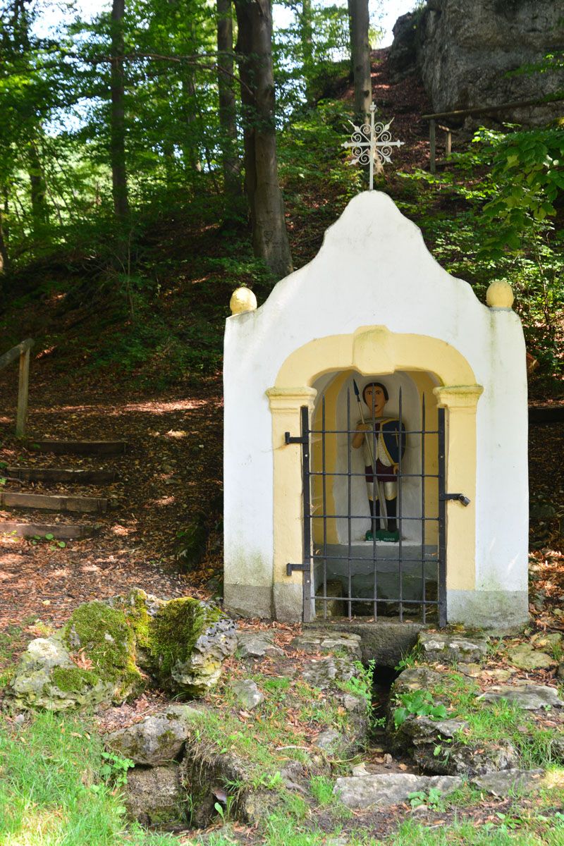 Die hübsche kleine Quelle liegt nur wenige Meter südlich der St 2242 entfernt direkt am Wegesrand. Folgt man den Stufen nördlich der Straße bergauf, so erreicht man einem besonders schönen Aussichtspunkt auf einer der Felsenklippen (49.705061, 11.183330), die das Tal des Moritzbaches säumen.