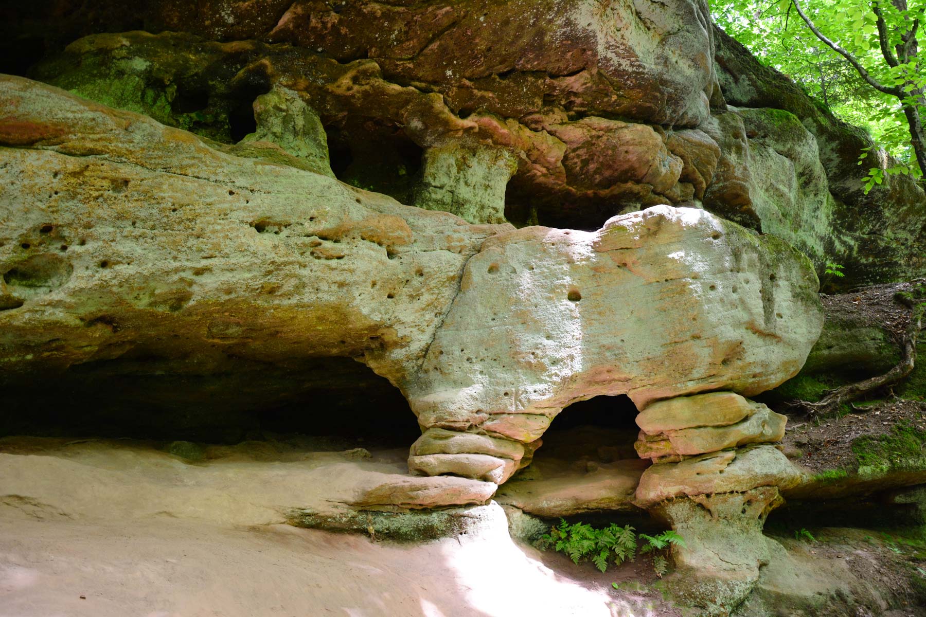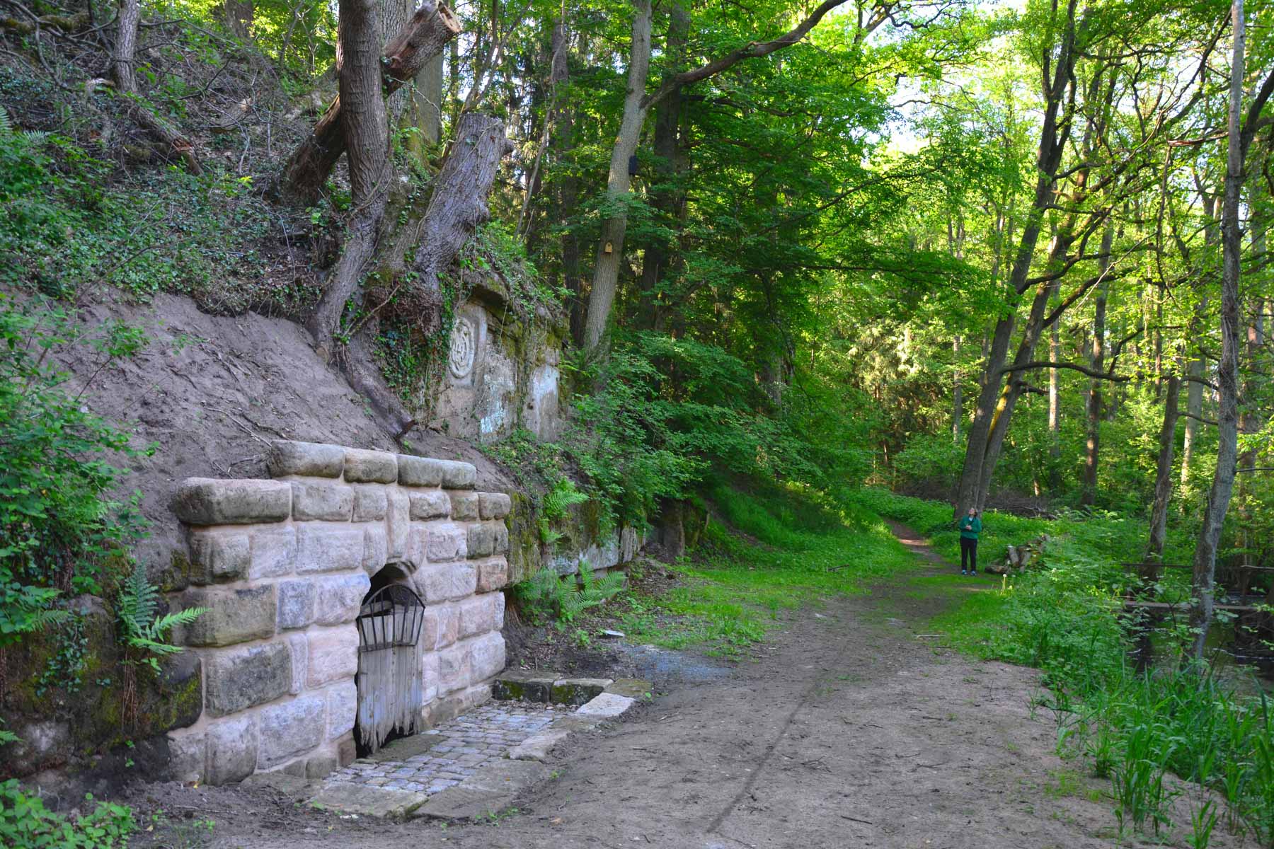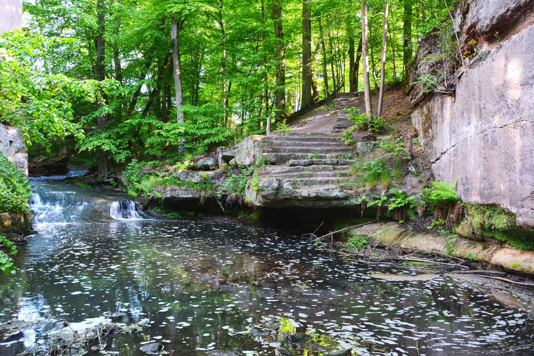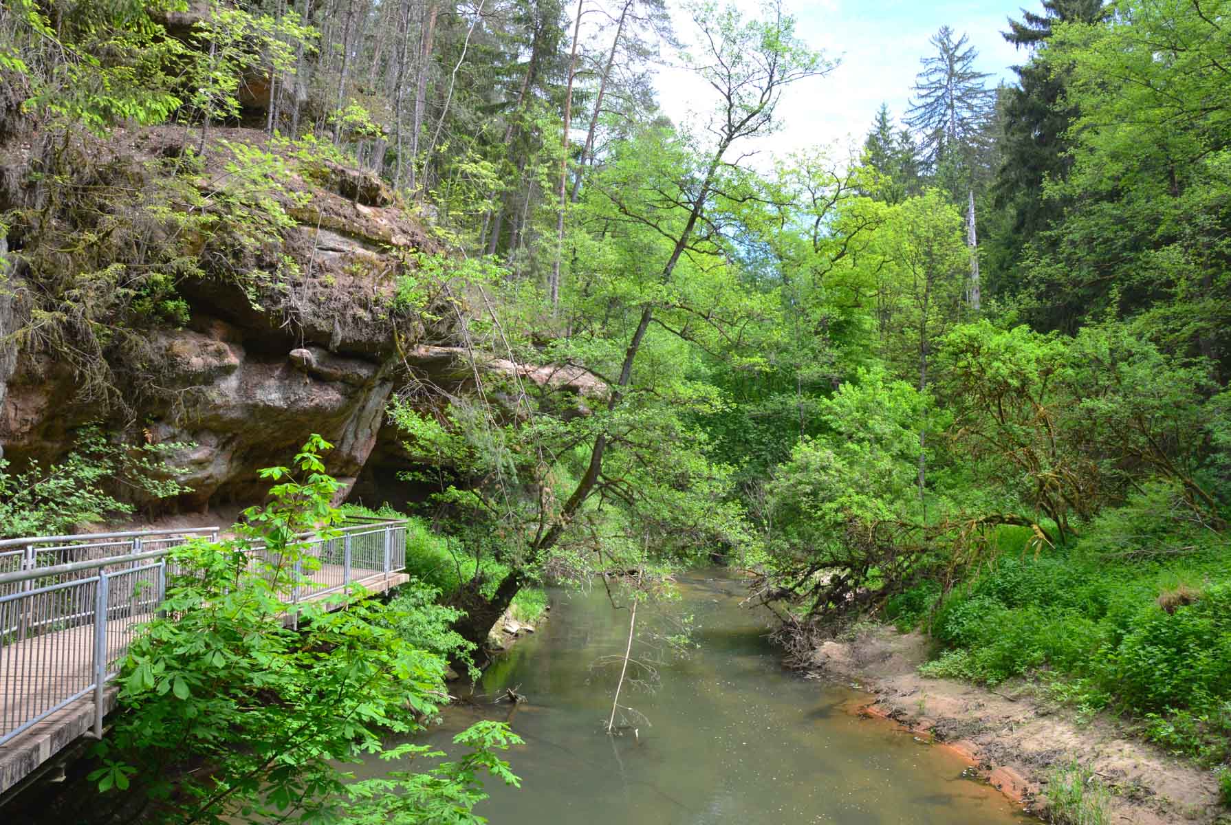 Dieser auch als Schwarzachschlucht oder -klamm bekannte Flussabschnitt an der südlichen Grenze des Lorenzer Reichswaldes ist als Geotop ausgewiesen und trägt zudem das Gütesiegeln von "Bayerns schönsten Geotopen". Durch die erosive Kraft ihres Wassers hat die Schwarzach hier entlang von Klüften und Verwerfungen im Gestein Bröckellöcher, große Auskolkungen, überhängende Dächer und Felsensäulen, die Gustav-Adolf-Höhle (49.351269, 11.229526) und die Karlshöhle geschaffen. In letzterer kann man beobachten, wie sich das spärliche Wasser einer kleinen Quelle aus einem Riss in dem sonst wasserundurchlässigen Gestein plagt - gerade einmal so viel, dass es die Höhlenwand befeuchtet und sparsam aus einem dünnen Rohr rinnt.