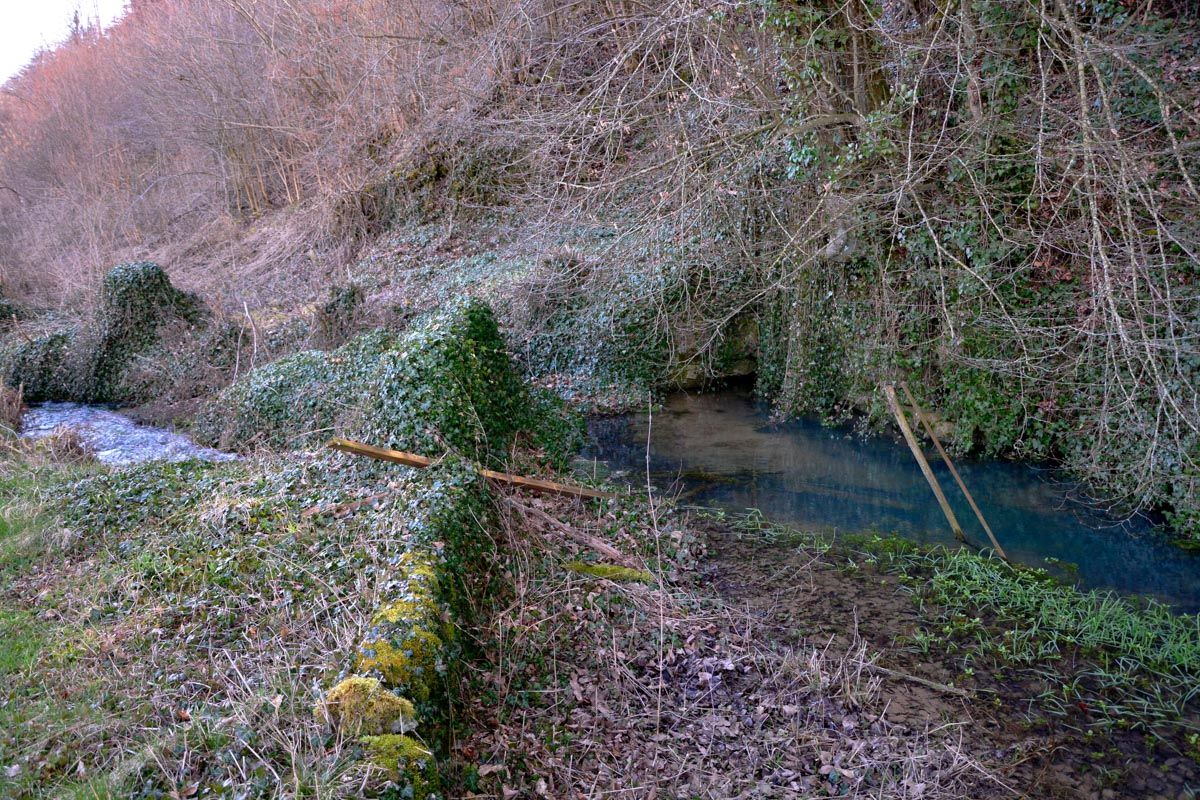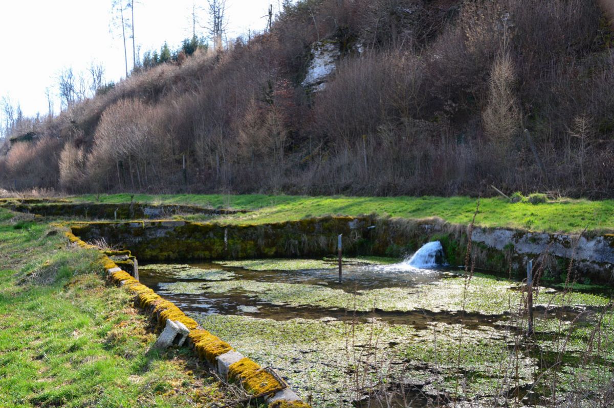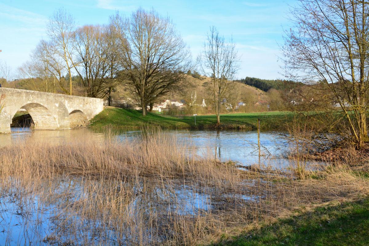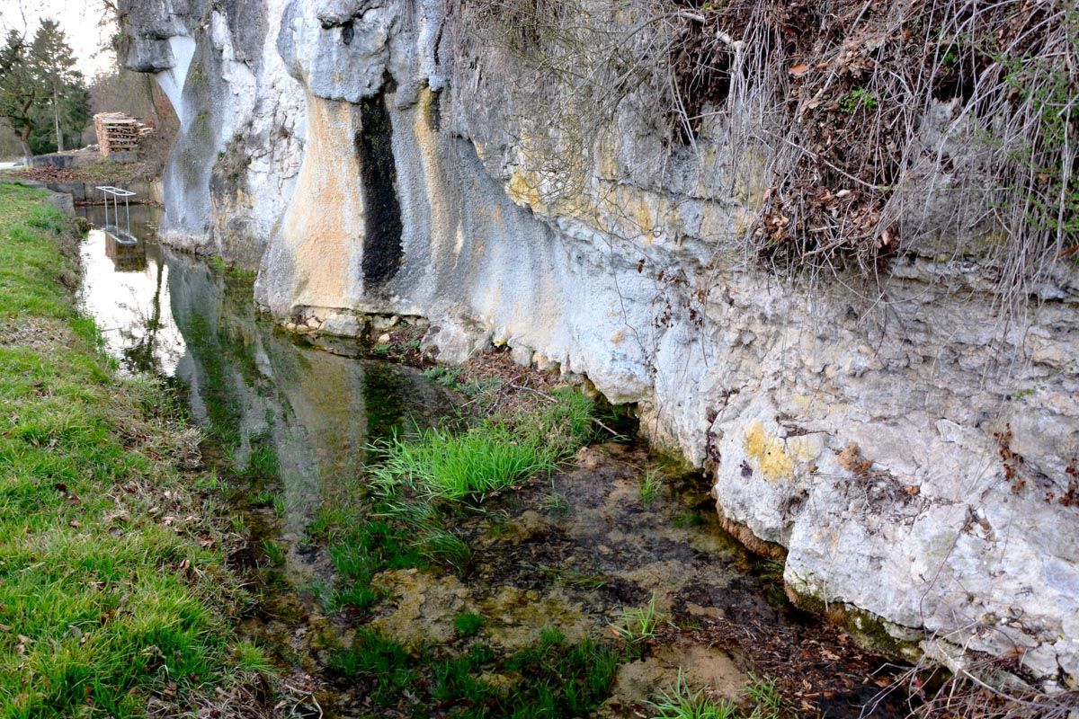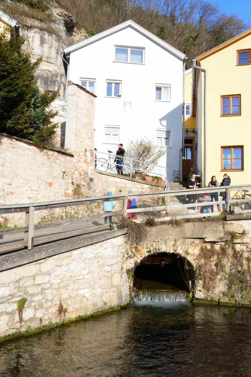 Durch die eindrucksvolle Altstadt von Eichstätt führt der Weg vorbei an der schönen Altmühlbrücke in Pfünz (48.889754, 11.259134) weiter zur Almosmühle, die bereits im Jahr 1282 erwähnt wird. Hier treten am Fuß eines mächtigen, überhängenden und von der Urdonau ausgewaschenen Dolomitfelsens fünf Karstquellen mit einer Schüttung von 35 l/s hervor, die zu einem Bach zusammengeführt sind und auch hier einst eine Mühle antrieben. Das Wasser stammt aus Ponordolinen auf der Hochfläche, bleibt auch nach Starkregen klar und hat eine recht konstante Temperatur von 10°C. Allerdings weist der Bewuchs des Quellbeckens auf einen überhöhten Nährstoffgehalt des Wassers hin, der durch Einträge auf der Albhochfläche verursacht ist, die in dem zerklüfteten Karstgestein nur unzureichend herausgefiltert werden.