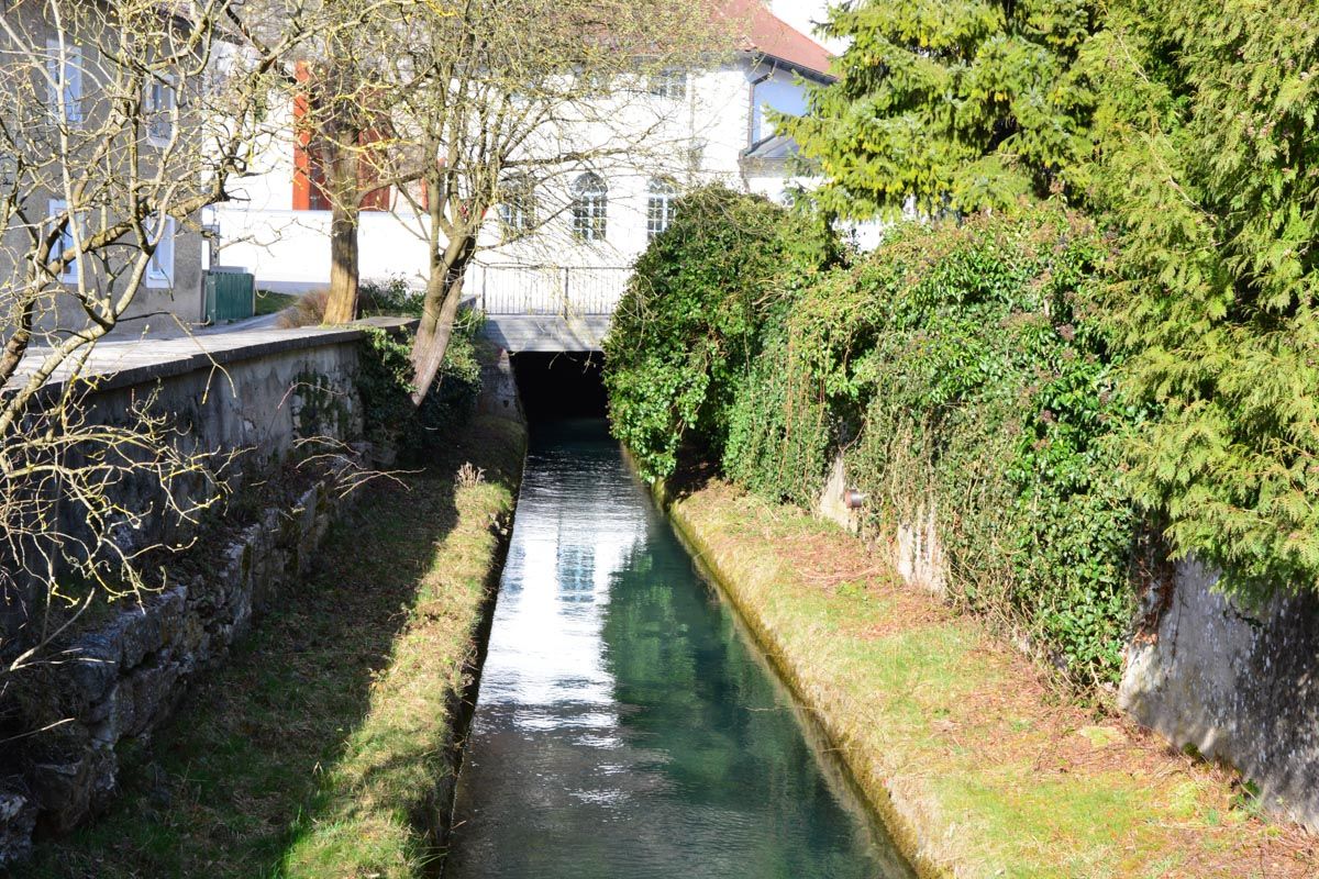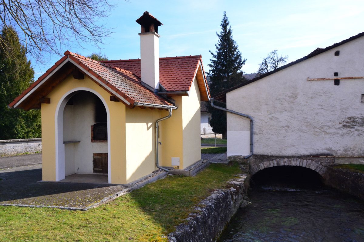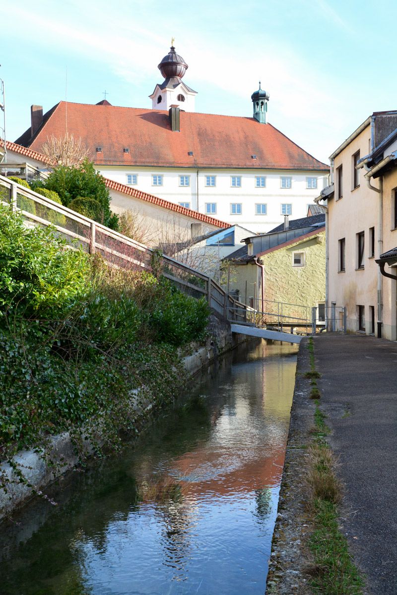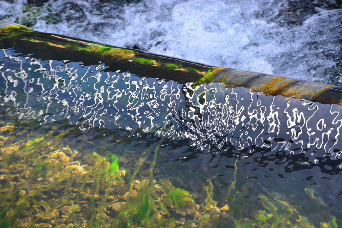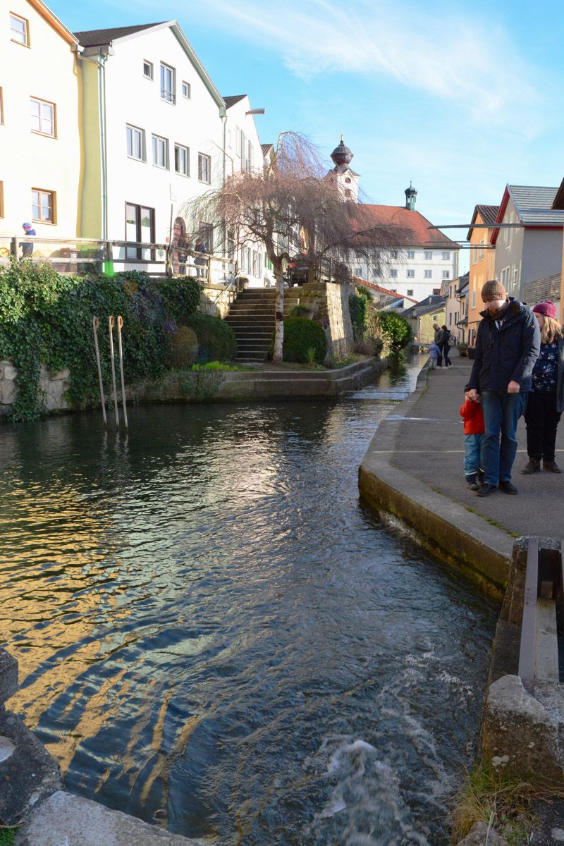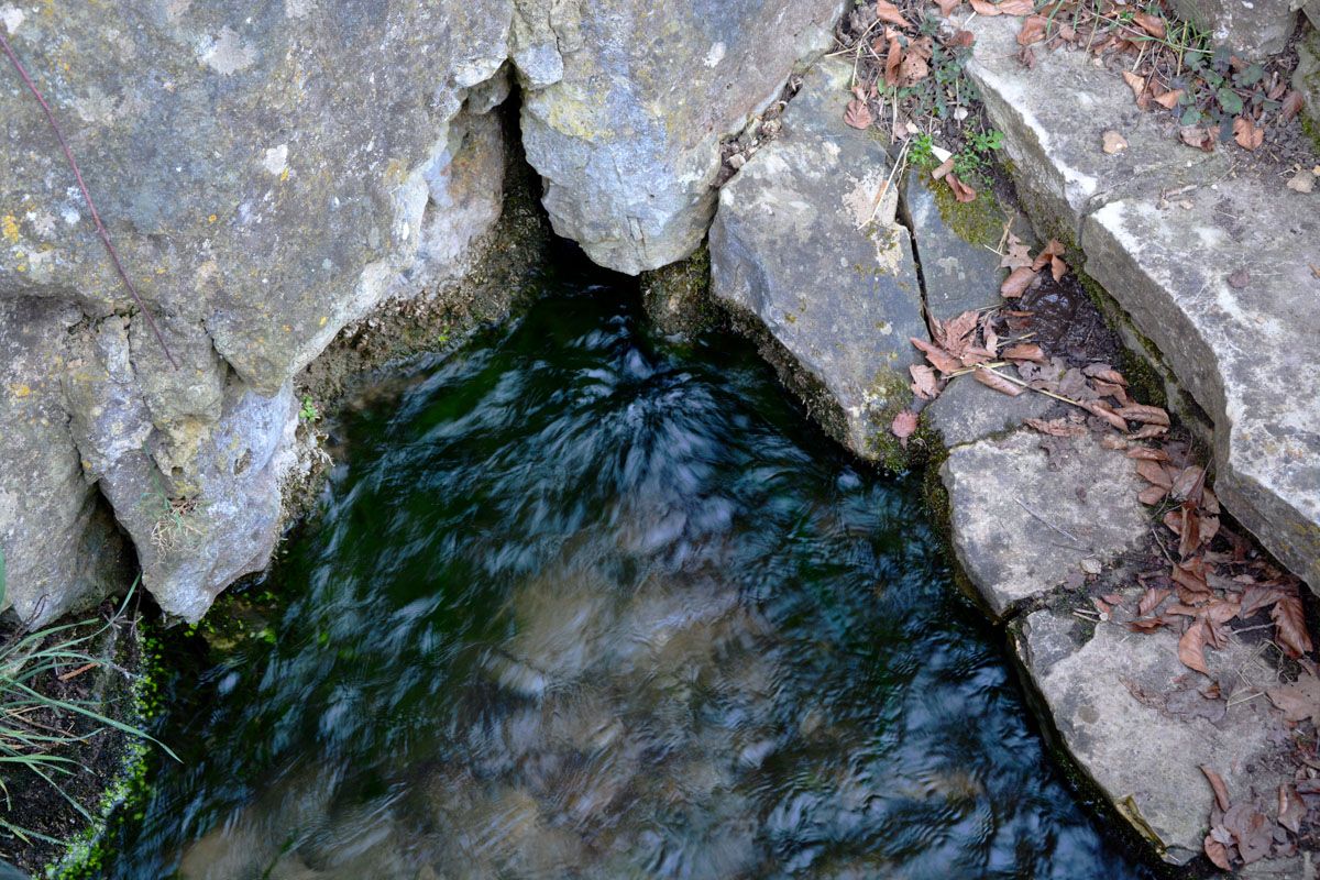 Durch die eindrucksvolle Altstadt von Eichstätt führt der Weg vorbei an der schönen Altmühlbrücke in Pfünz (48.889754, 11.259134) weiter zur Almosmühle, die bereits im Jahr 1282 erwähnt wird. Hier treten am Fuß eines mächtigen, überhängenden und von der Urdonau ausgewaschenen Dolomitfelsens fünf Karstquellen mit einer Schüttung von 35 l/s hervor, die zu einem Bach zusammengeführt sind und auch hier einst eine Mühle antrieben. Das Wasser stammt aus Ponordolinen auf der Hochfläche, bleibt auch nach Starkregen klar und hat eine recht konstante Temperatur von 10°C. Allerdings weist der Bewuchs des Quellbeckens auf einen überhöhten Nährstoffgehalt des Wassers hin, der durch Einträge auf der Albhochfläche verursacht ist, die in dem zerklüfteten Karstgestein nur unzureichend herausgefiltert werden.