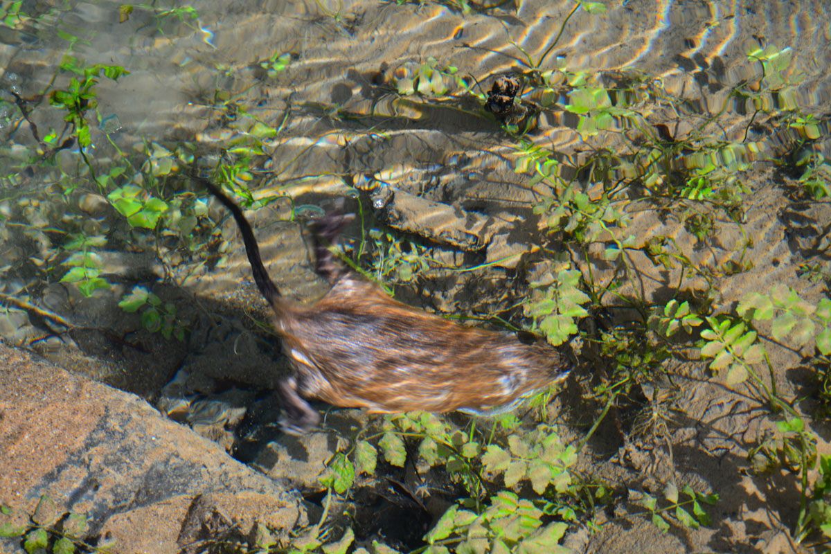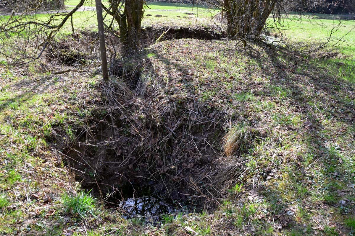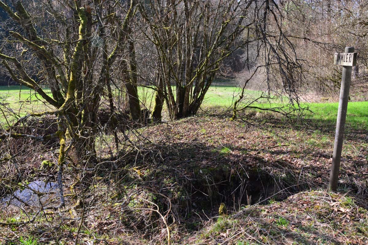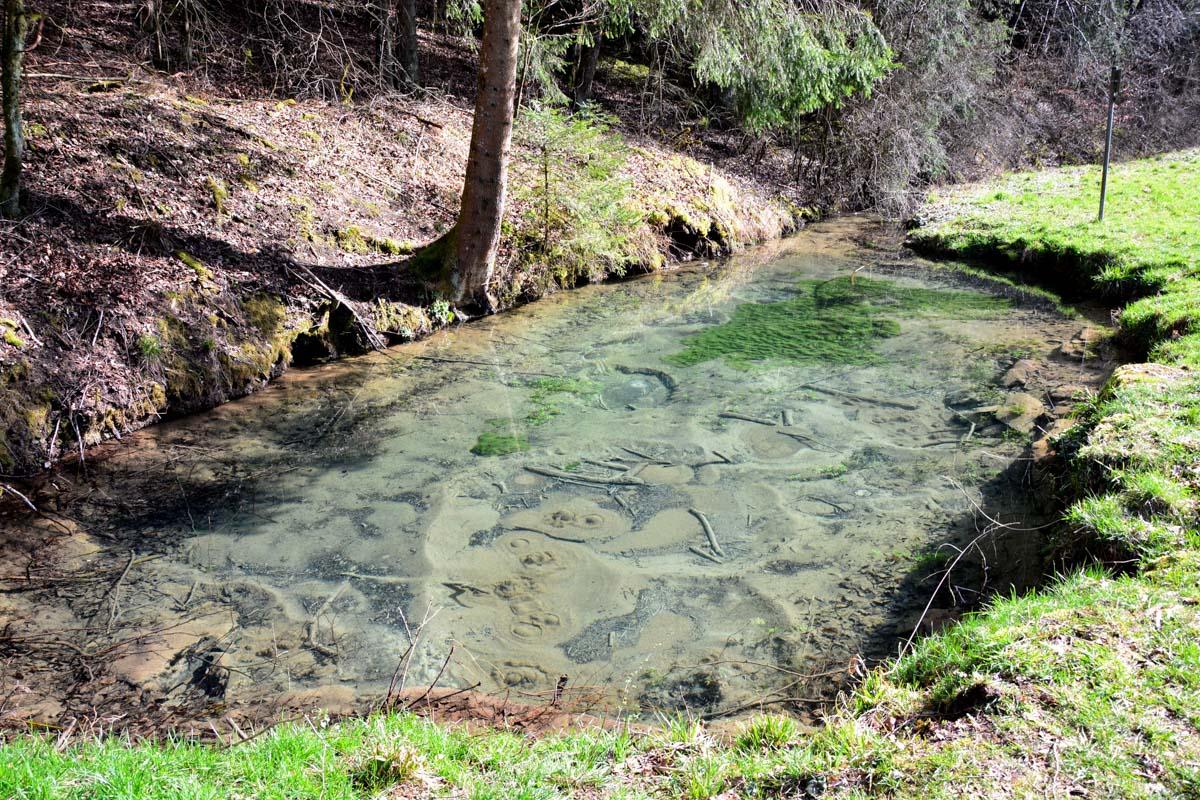 Wenn man genügend Zeit und Ruhe mitbringt, hat man vielleicht das Glück, auch einen Bewohner des Tümpels kennenzulernen: In einem Erdloch am Rand der Quelle wohnt nämlich eine Wasserrattenfamilie.