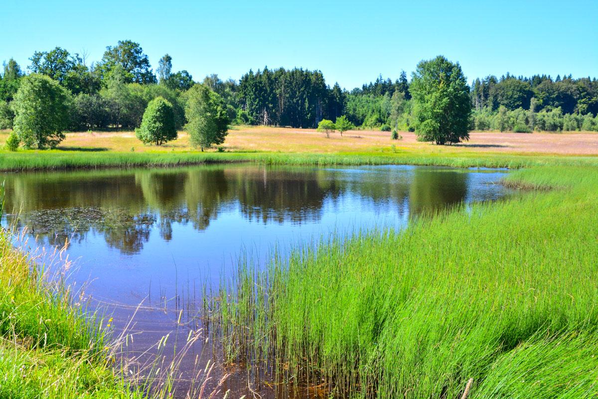 Beeindruckend ist die außerordentlich vielfältige Flora. So kann man mit ein wenig Glück Trollblumen, verschiedene Arten von Orchideen, Lupinien und Schwertlilien entdecken. Und wenn das fahle Wollgras silberhaarig übers Moor geistert, mag mancher Besucher im Abendschein sogar leise erschauern. Wunderschön ist es hier auch später im Jahr, wenn die Farben des Herbstes in die Weiherwiesen gestreut sind und die bizarr aufgewachsenen Moorbirken im lodernden Blättergewand vor dem Wald stehen.