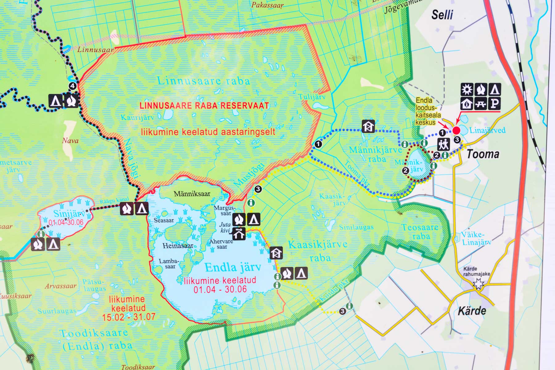 Der Weg mit Namen Männikjärve raba opperada, der von einem Parkplatz am Suur Linajärv (58,87652 26,27247) nach Westen führt, eignet sich bestens, um diese beeindruckende Naturlandschaft mit ihren Mooren, Wäldern und Seen kennenzulernen. Je nachdem wie weit die Füße tragen, kann man entweder nur bis zum Aussichtsturm im Männikjärve raba gehen oder auch eine ganztägige Wanderung unternehmen. In regenreichen Perioden muss man sich allerdings darauf einstellen, dass einige Abschnitte der Wege nicht oder nur mit Gummistiefeln passierbar sind.