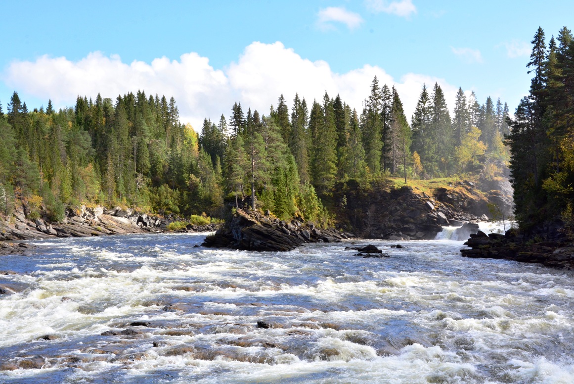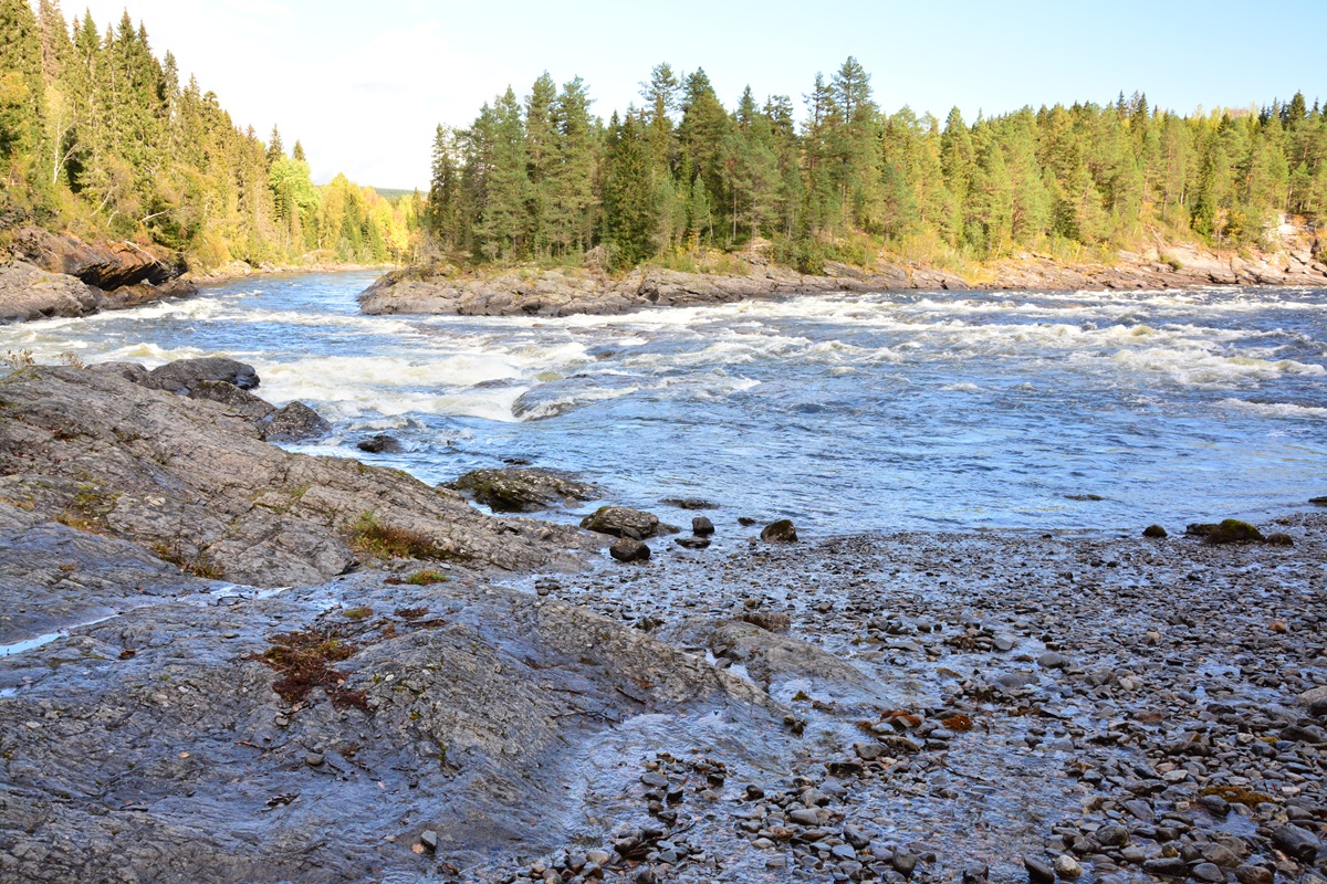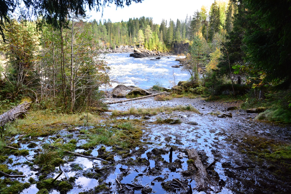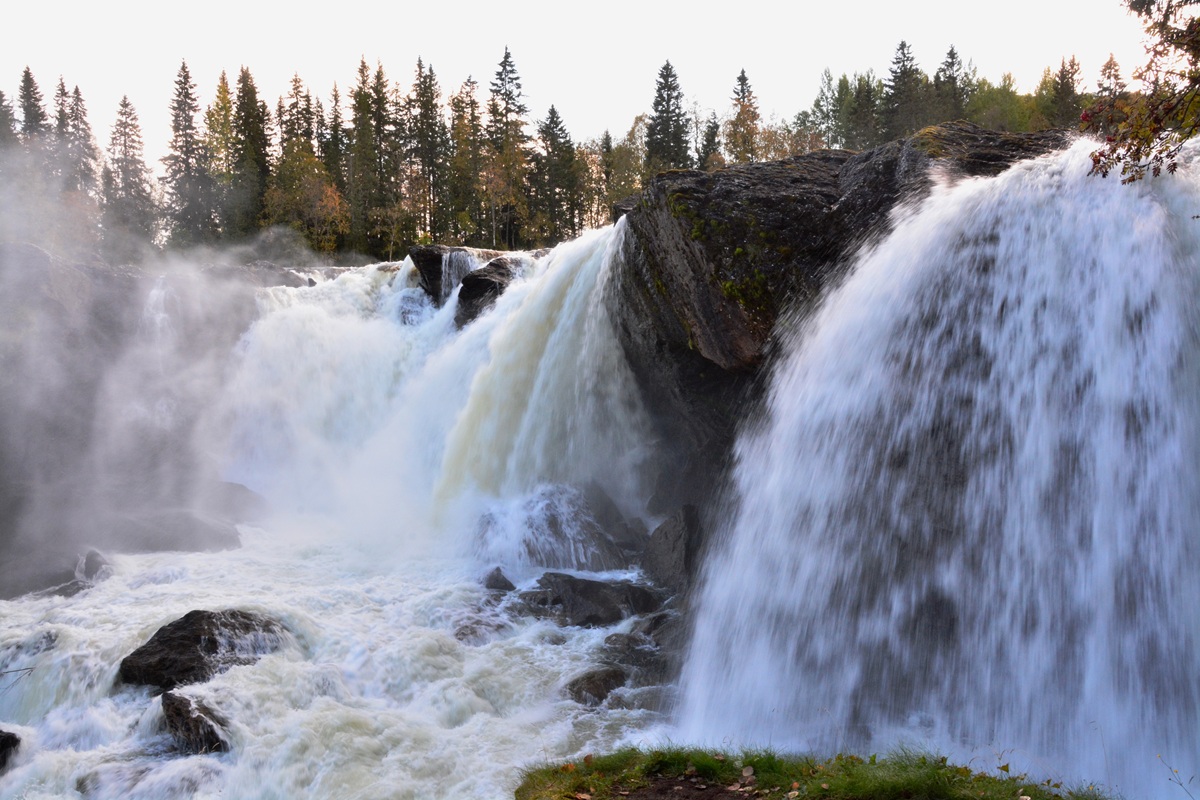 Der Ristafallet in der Provinz Jämtland liegt am St. Olavsleden (https://www.wanderzentrale.de/st-olavsleden-pilgern/), einem 564 Kilometer langen Pilgerweg, der vom Nidarosdom in norwegischen Trondheim über die Grenze bis ins kleine schwedische Selanger führt. Der Wasserfall gilt als einer der schönsten in Schweden. Je nach Jahreszeit stürzt der Fluss Indalsälven mit Wassermengen von 100 bis 400 m3/s über eine Geländekante 14 Meter tief hinab. Dabei zerstäubt die tobende Gischt so stark, dass selbst in der trockenen Jahreszeit ein feuchtes Milieu entsteht, in dem seltene Flechten, Moose und Gräser gedeihen, weshalb die Wälder an den Flussufern einen besonderen Schutzstatus erhalten haben.