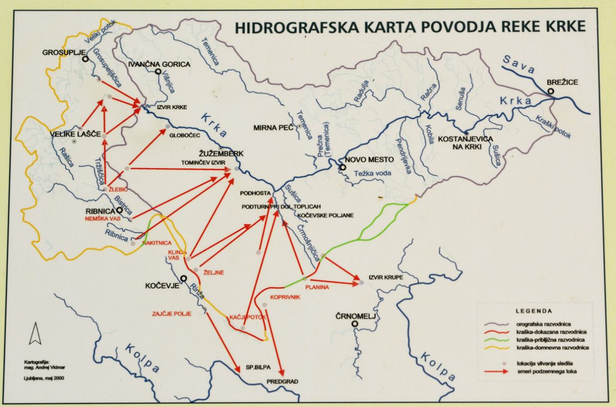 Die Krka entspringt zwei benachbarten Karstquellen, hinter denen sich jeweils eine Höhle befindet: an der Hauptquelle die Krska Jama und an der Nebenquelle die Jama Poltarice. Die Jama Krska ist eine kleine, aber interessante Schauhöhle mit einer bereits vorchristlichen Besiedelung, die schon in den 1930er-Jahren zugänglich gemacht wurde. Die Schüttung beider Quellen ist - wie bei vielen Karstquellen - sehr abhängig von den vorangegangenen Niederschlägen. Bei der Schneeschmelze und nach sehr starken Regenfällen dringt das Wasser auch aus den etwas höher gelegenen Höhlen an die Oberfläche, die sonst aber trocken sind.