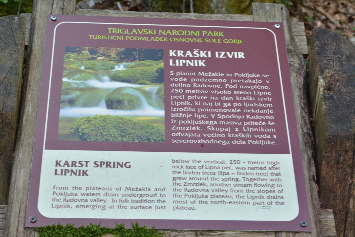 Das Tal der Radovna liegt zwischen den beiden Hochplateaus Mezaklja und Pokljuka mit ihren waldreichen Hängen und ist Teil des Triglav-Nationalparks. Der Wasserzufluss kommt überwiegend aus dem Triglav-Gebiet, wo Kotarica und Krmarica (benannt wie die Täler Kot und Krma) mit ihren Zuflüssen zuerst versickern, dann wieder in zahlreichen kleinen Quellen austreten, die zum Fluss Radovna zusammenfließen. Etwa 17 Kilometer nach diesem Quellbereich mündet die Radovna bei Moste in die Sava Dolinka.