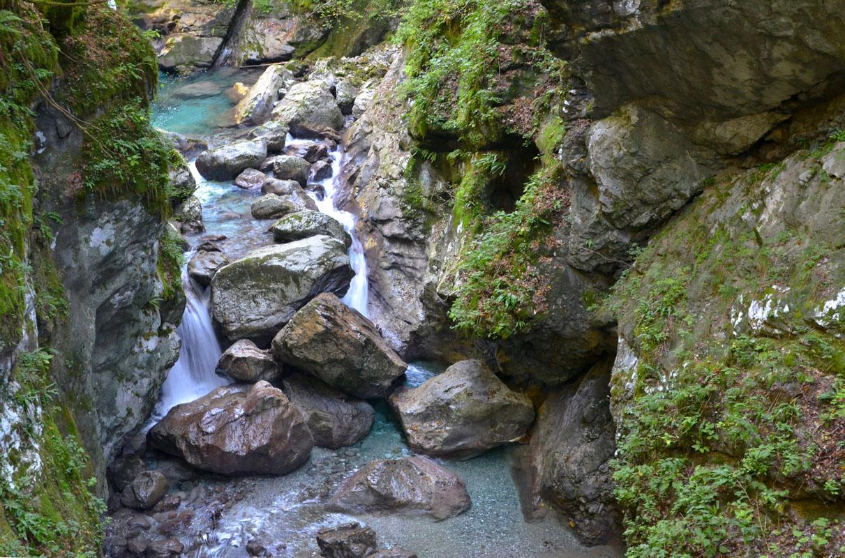 Die pittoreske Tolmin-Klamm liegt am niedrigsten und gleichzeitig südlichsten Punkt des Nationalparks Triglav nahe der Gemeinde Tolmin. Zu Anfang des 20. Jahrhunderts wurde bereits die stählerne Hudicev Most ("Teufelsbrücke") als Ersatz für eine alte Holzbrücke an der Straße hoch zum Dorf Zadlaz-Cadrg erbaut. Die Wege in der Klamm mit ihren bis zu 60 Meter hohen, steilen Felswänden wurden dann zwischen 1953 und 1958 angelegt.