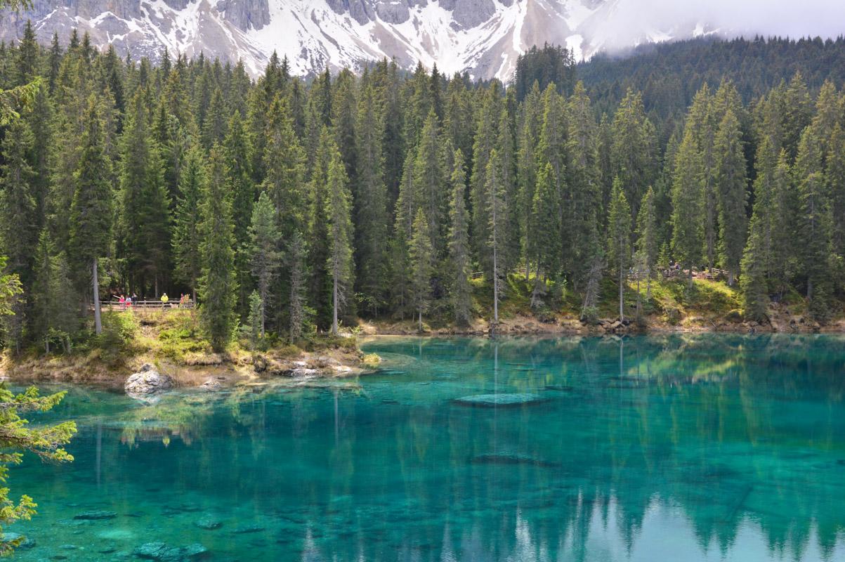 Der See ist von Wald umgeben, als geschütztes Naturdenkmal umzäunt und seine Ufer dürfen nicht betreten werden. Allerdings führt ein Spazierweg mit Aussichtskanzeln um ihn herum - wohl einer der am meisten frequentierten Spazierwege Italiens. Denn der See ist wegen seiner herausragenden Schönheit und seiner Nähe zu Bozen Pflichtprogramm der beliebten Busreise nach Südtirol.
