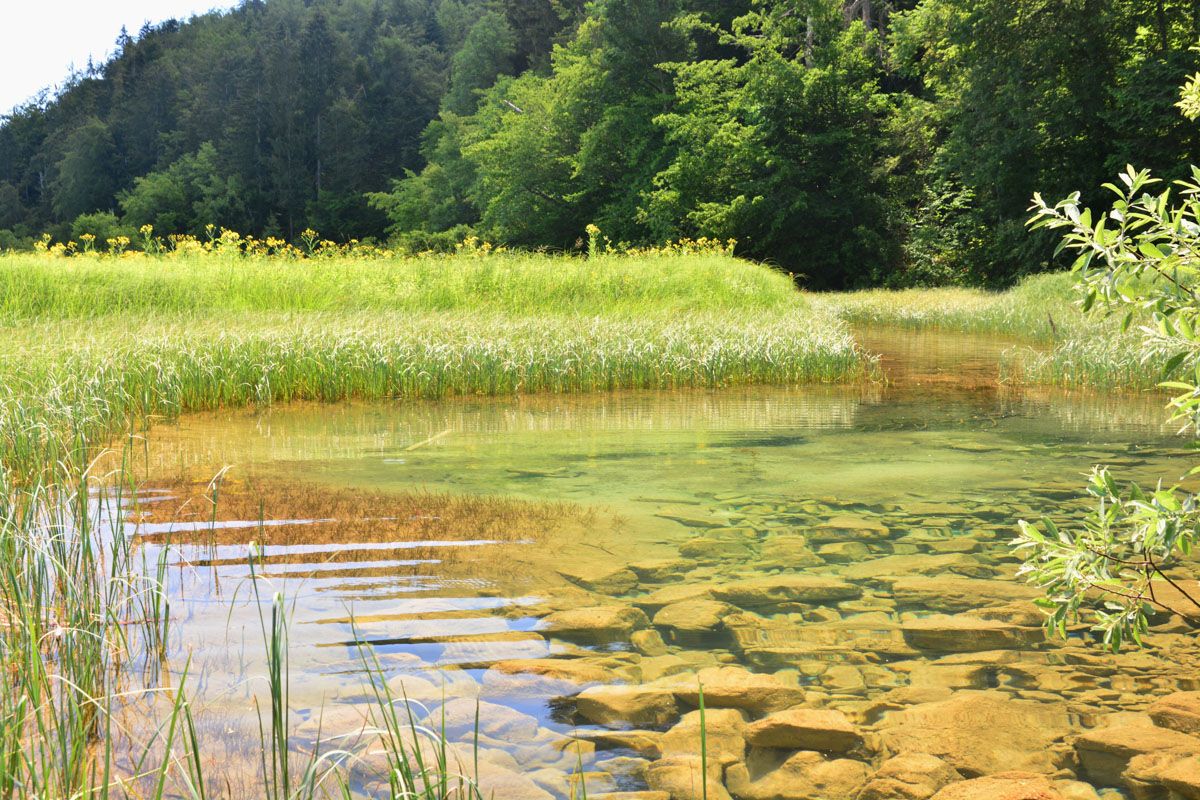 Die beiden Quelltöpfe liegen in einem wunderbar natürlichen, lichten Wald direkt am Weg und sind gut zugänglich - anders als die meisten Quellen auf dem Seengebiet, die stark mit Schilf eingewachsen sind. Im Sommer lädt dieser herrliche Platz mit dem dann ruhig aus der Erde tretenden, geheimnisvoll gefärbten Wasser zur Besinnung ein. Im Frühjahr nach der Schneeschmelze sieht man hingegen wilde Wassermassen, die hier ungezähmt aus dem Boden quellen.