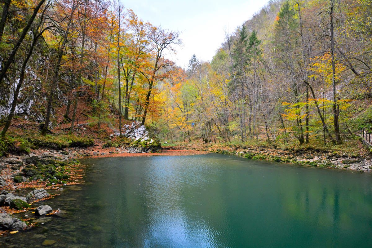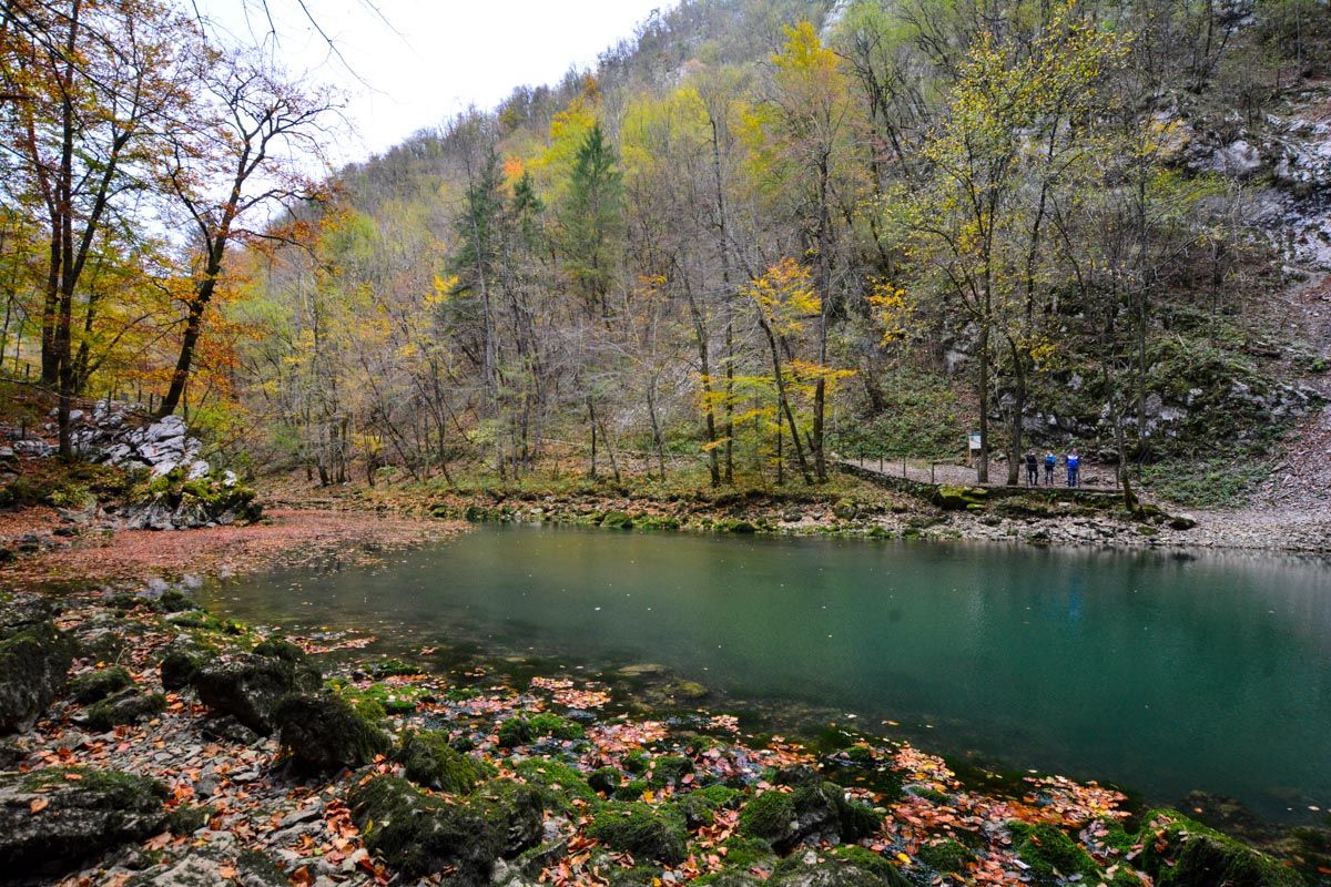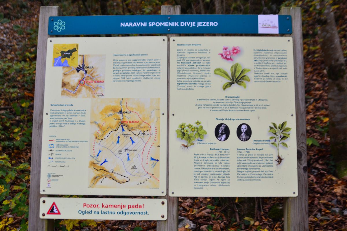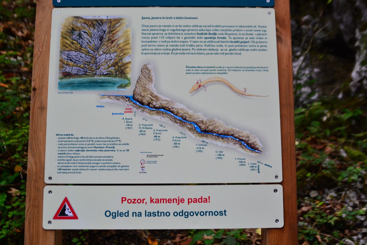 Der Divje-See ist ein Karstsee unmittelbar am Fluss Idrija. Er liegt in einem Steinkessel unter einer fast 200 Meter hohen Felswand. Sein Quellwasser bezieht er aus einer steil abfallenden Höhle am Grund des Sees, die bis zu einer Tiefe von 160 Metern erforscht wurde.
