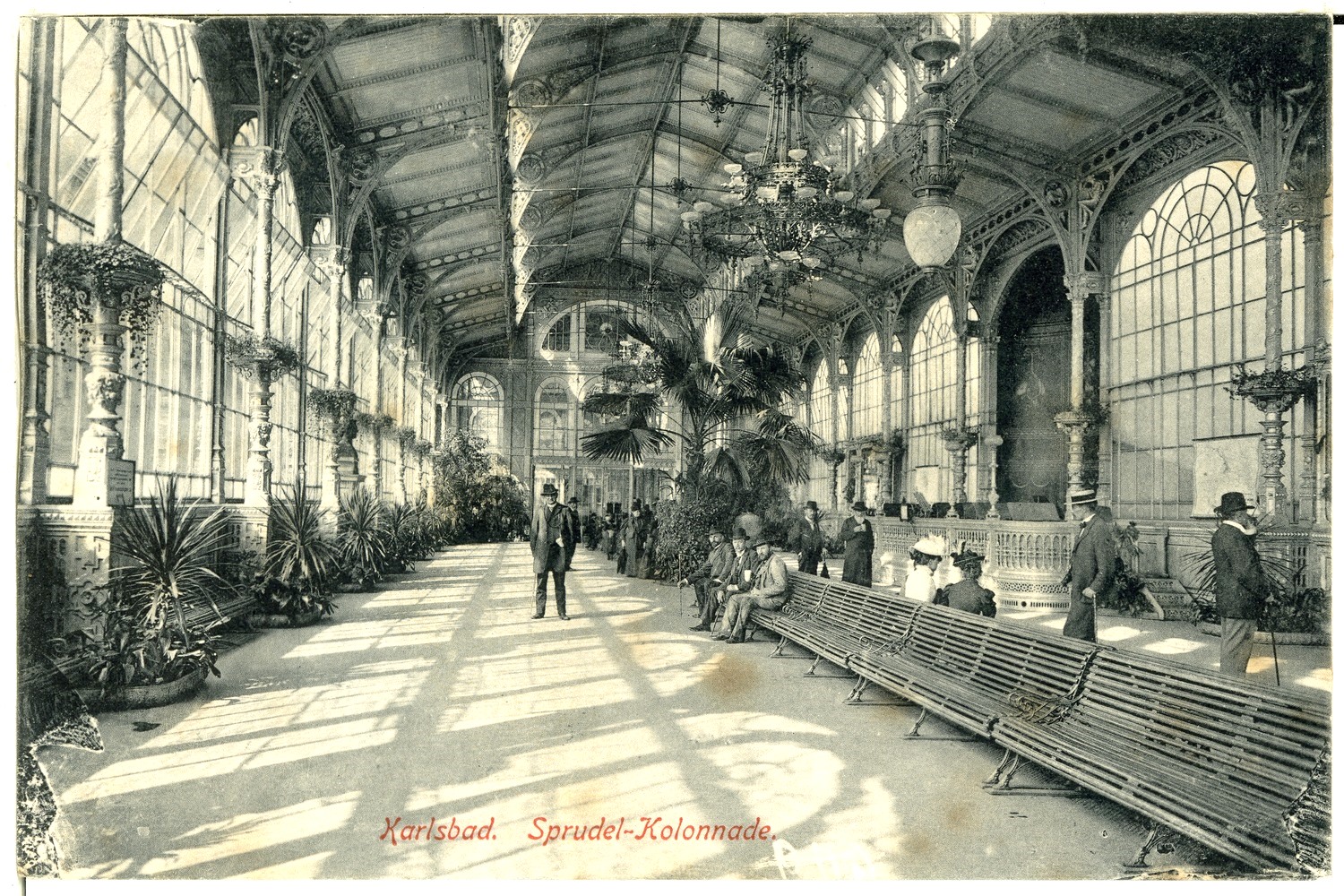 Historische Aufnahme der Karlsbader Sprudelkolonaden (Datei:00609-Karlsbad-1898-Sprudel-Kolonade-Brück & Sohn Kunstverlag.jpg)
